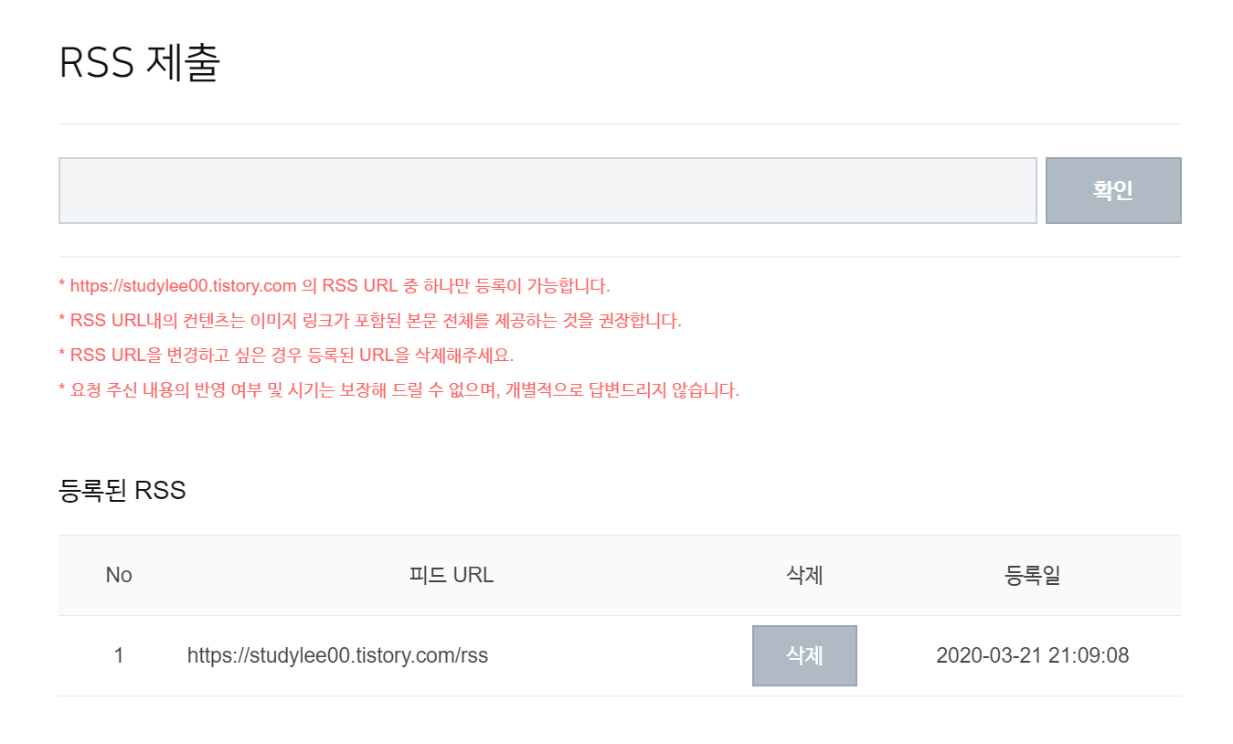 덤으로... RSS 제출 역시 사이트 주소 뒤에 /rss 만 추가하여 제출하면 된다
