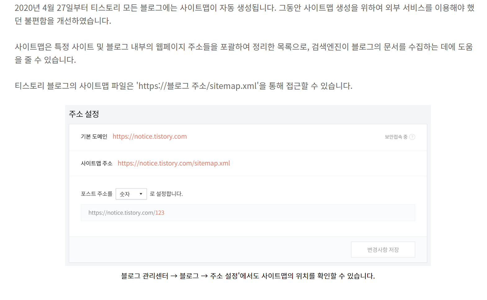 안녕하세요 티스토리팀입니다. 2020년 4월 27일부터 티스토리 모든 블로그에는 사이트맵이 자동 생성됩니다. 그동안 사이트맵 생성을 위하여 외부 서비스를 이용해야 했던 불편함을 개선하였습니다. 사이트맵은 특..