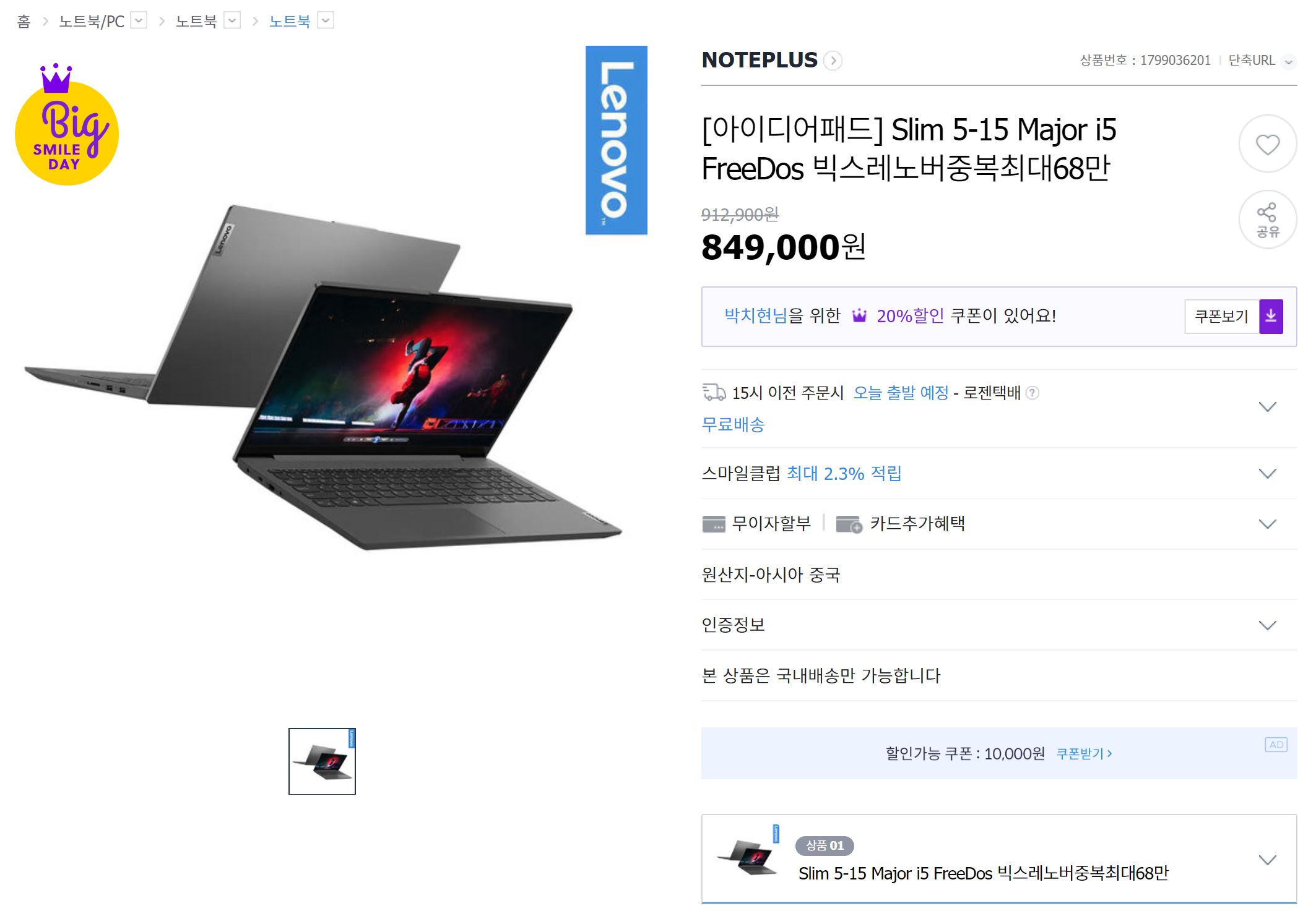판매자 할인이 들어가서 빅스마일데이 혜택을 안 받았을때는 849,000원