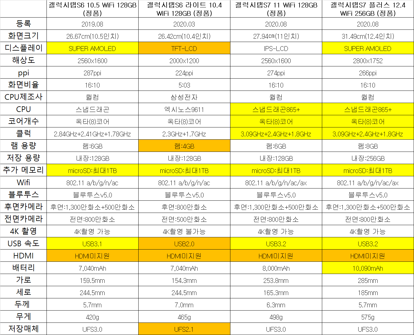 갤럭시탭 S7 FE(탭 S7 lite) 공개된 스펙 정리 - S7 FE, S7+, S7과 비교 및 차이점