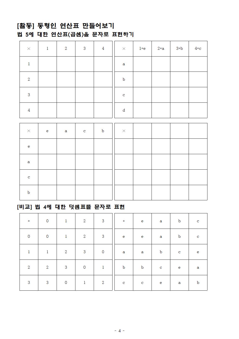 4번표에서 e를 0으로, a를 1로, c를 2로, b를 3으로 바꾸면 덧셈과 동형 완성
