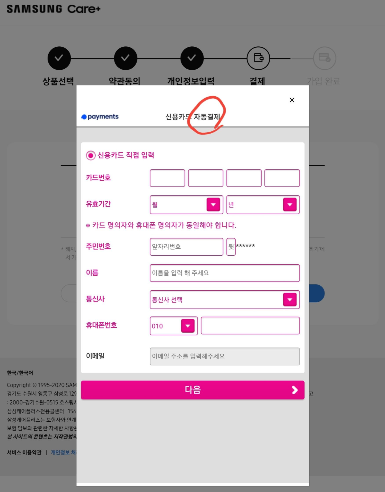 약관 동의, 개인정보입력 후에 결제 창이 뜨는데