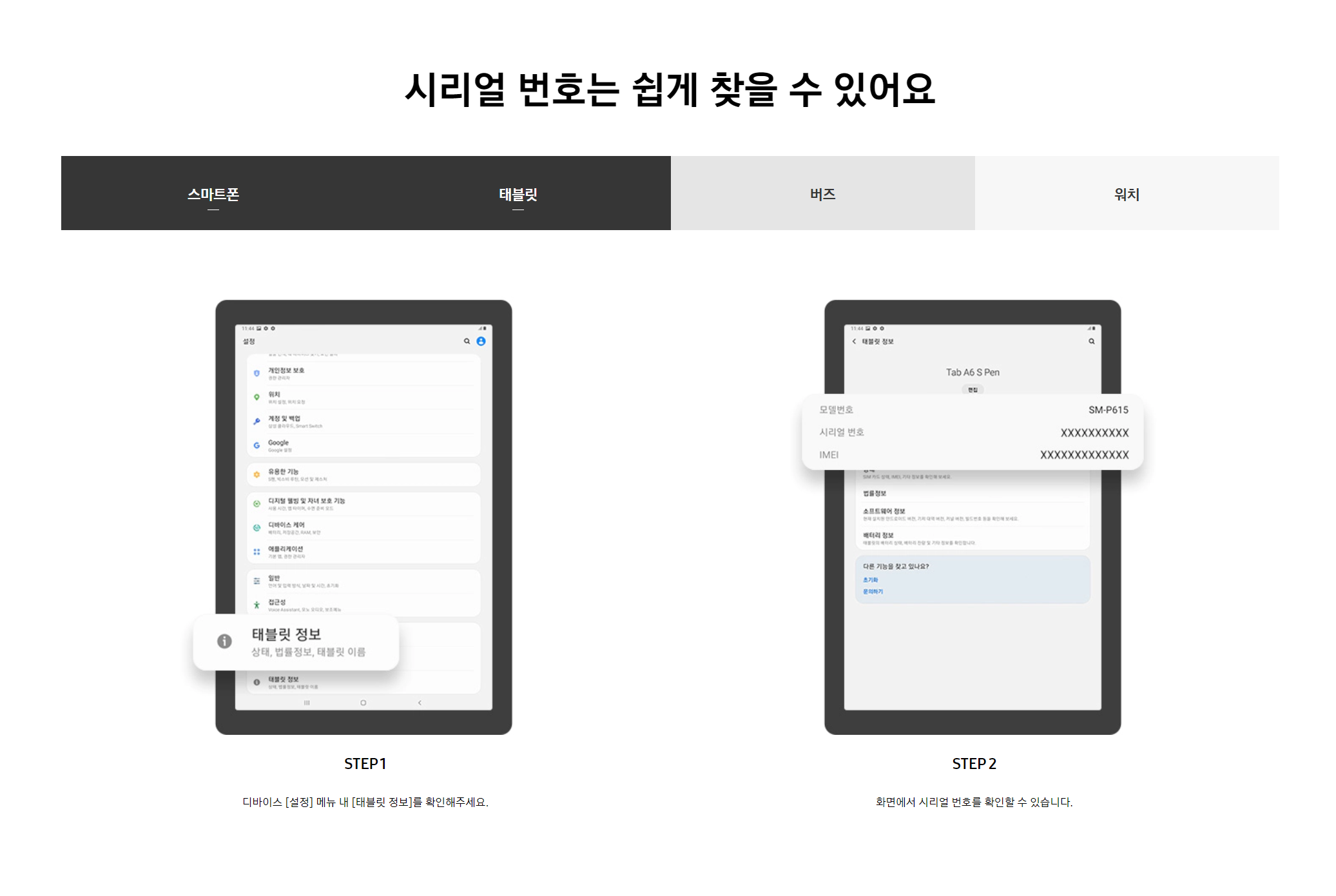 홈페이지나 휴대폰 등 다른 경로로 가입할 시 태블릿의 시리얼 넘버는 아래와 같이 확인하면 된다.