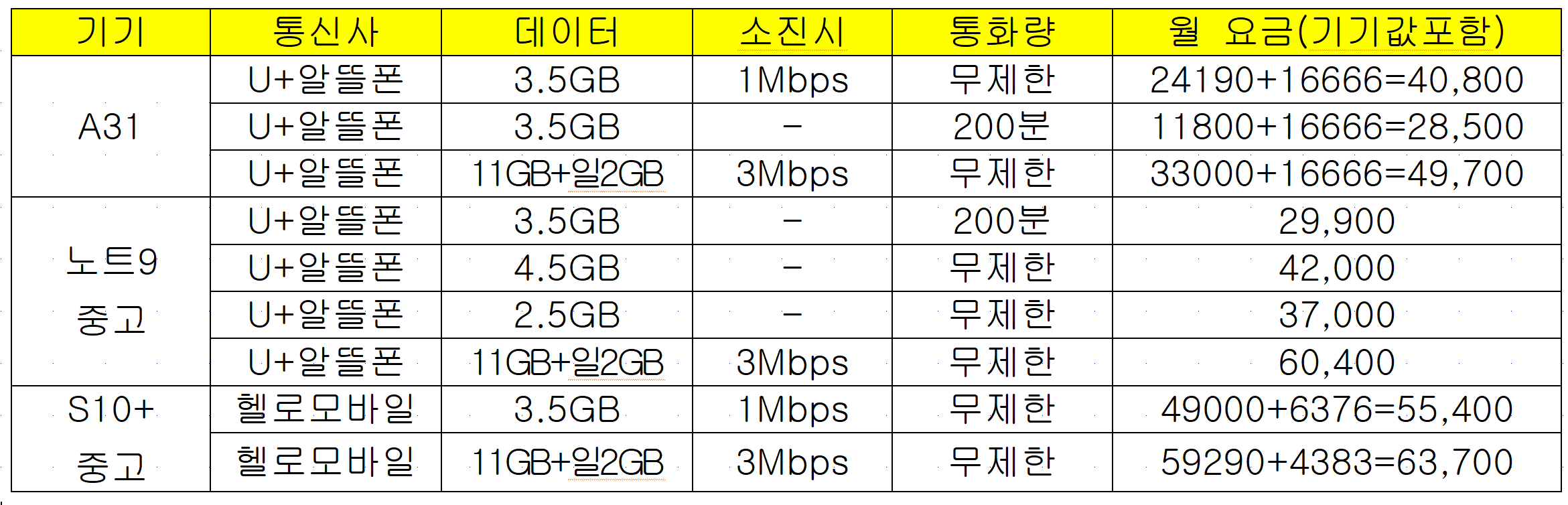 A31 신폰보다 비싸게 책정되어 있으니.. A31도 동일한 요금제라고 보자.