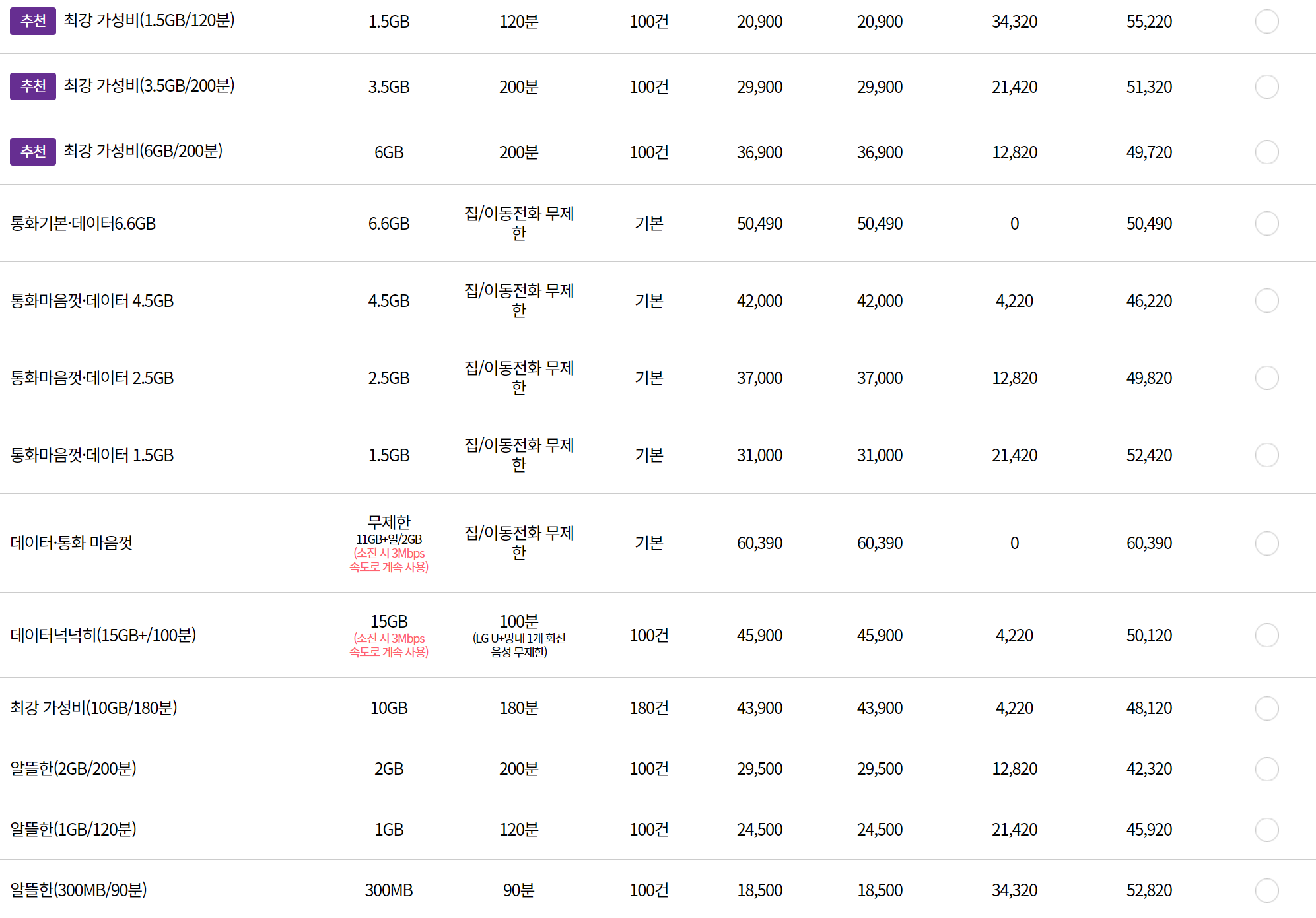 24,190원(3.5GB, 다 써도 1Mbps 사용 가능..)