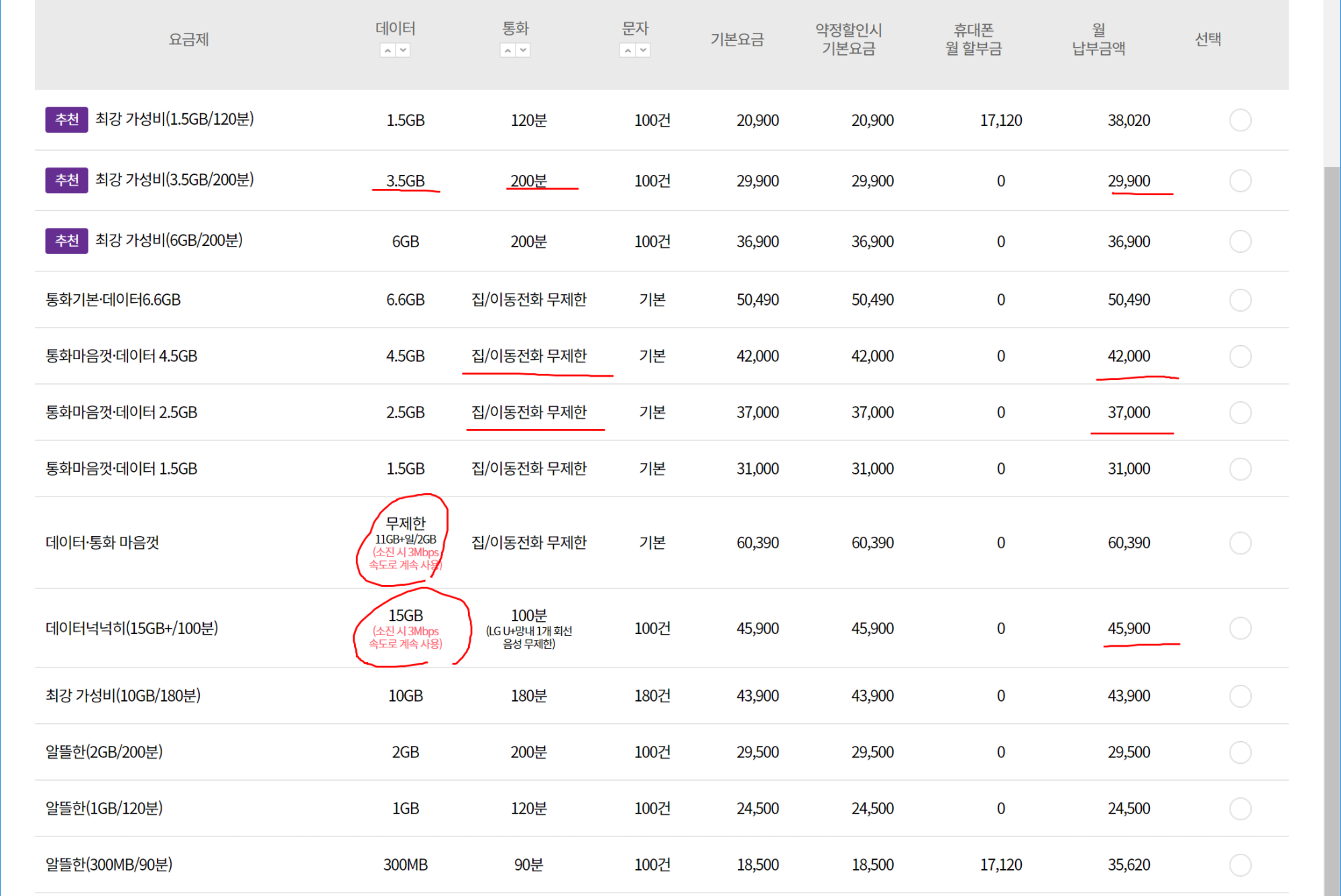 6만원 이상의 요금제를 쓰지 않으면 기계값이 할부로 나온다 ㅋㅋ