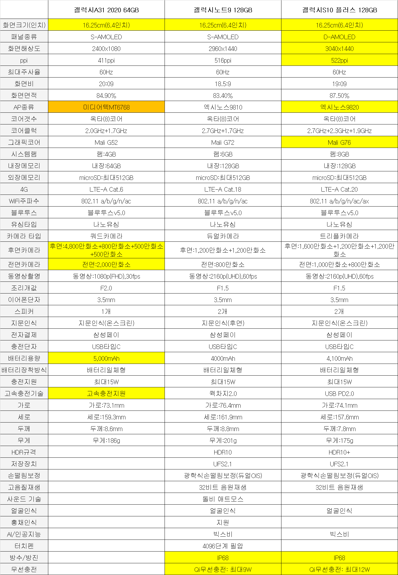 비교 대상은 노트9 vs s10 플러스 vs a31