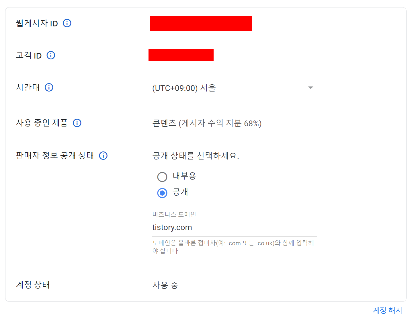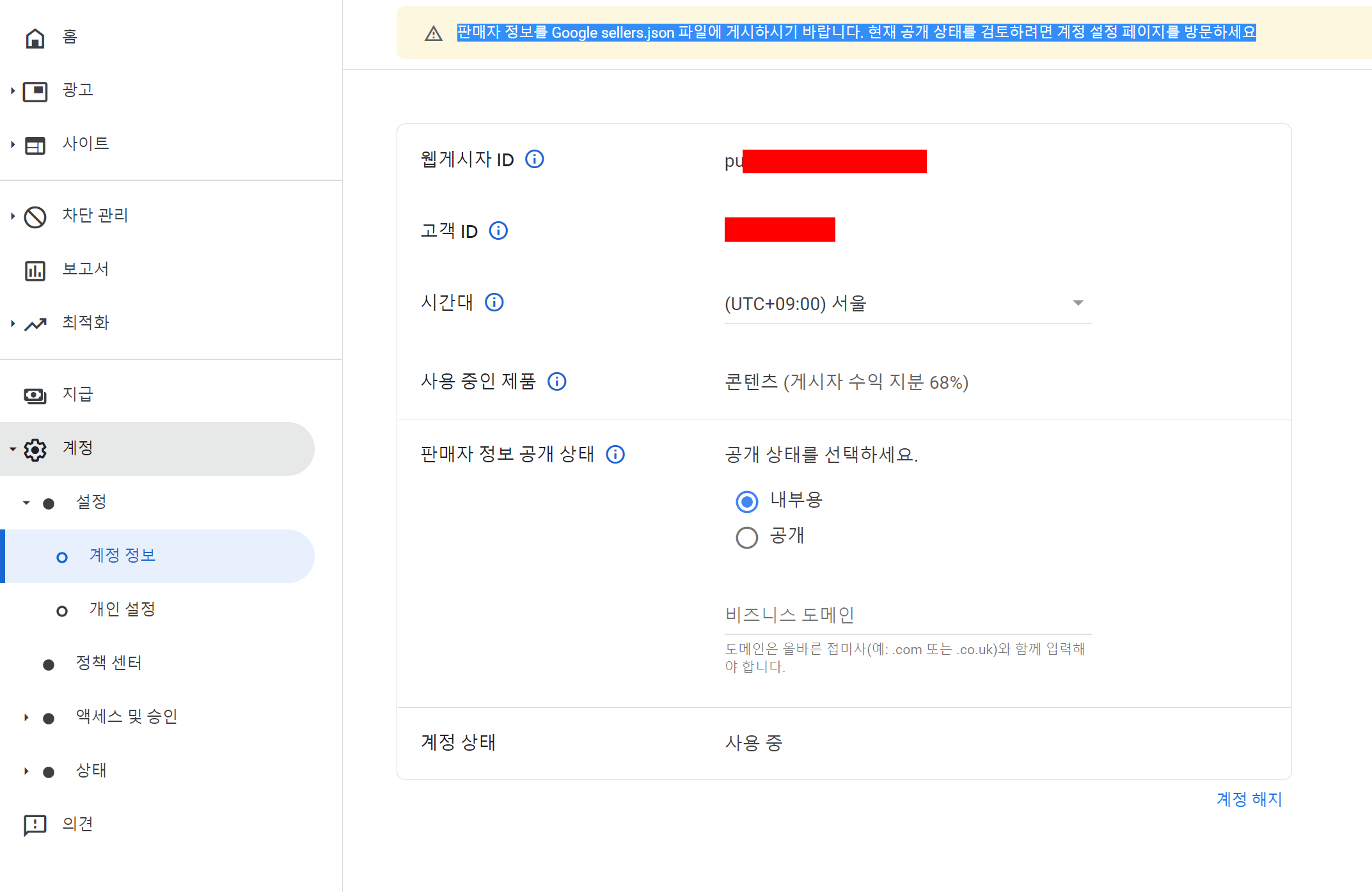 "판매자 정보를 Google sellers.json 파일에 게시하시기 바랍니다. 현재 공개 상태를 검토하려면 계정 설정 페이지를 방문하세요"