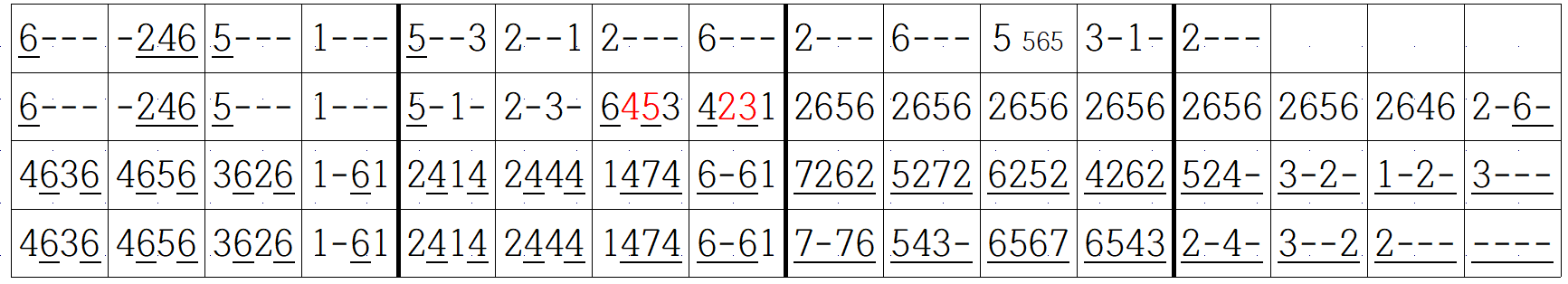 첫마디는 낮은음 6이 반복, 두번째 마디는 낮은음 4, 세번째 마디는 낮은음 2 라고 기억하고