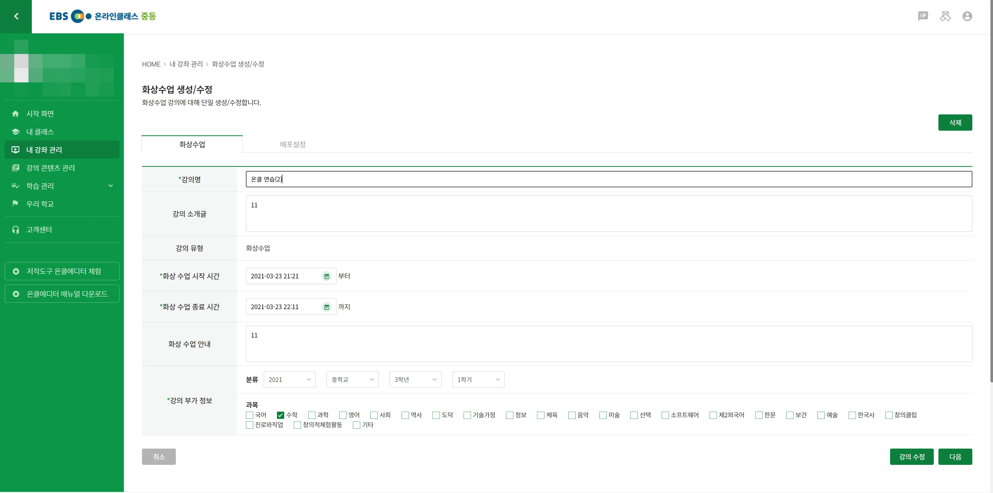 강좌 개설에서 화상수업을 개설