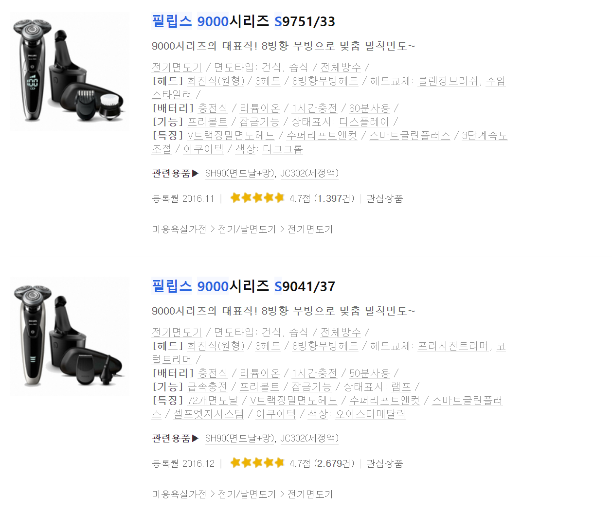 + 7000시리즈의 면도날은 5000시리즈와 공유함(SH71 / SH72)