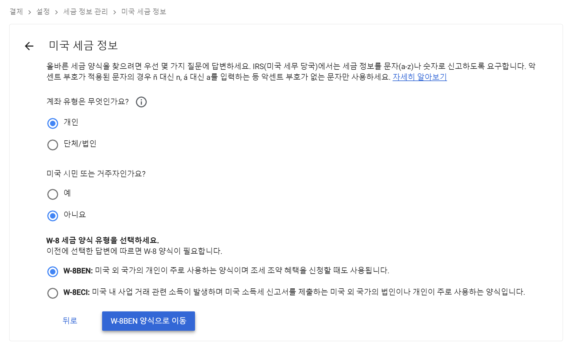 세금 양식 유형: 미국 외 = W-8BEN
