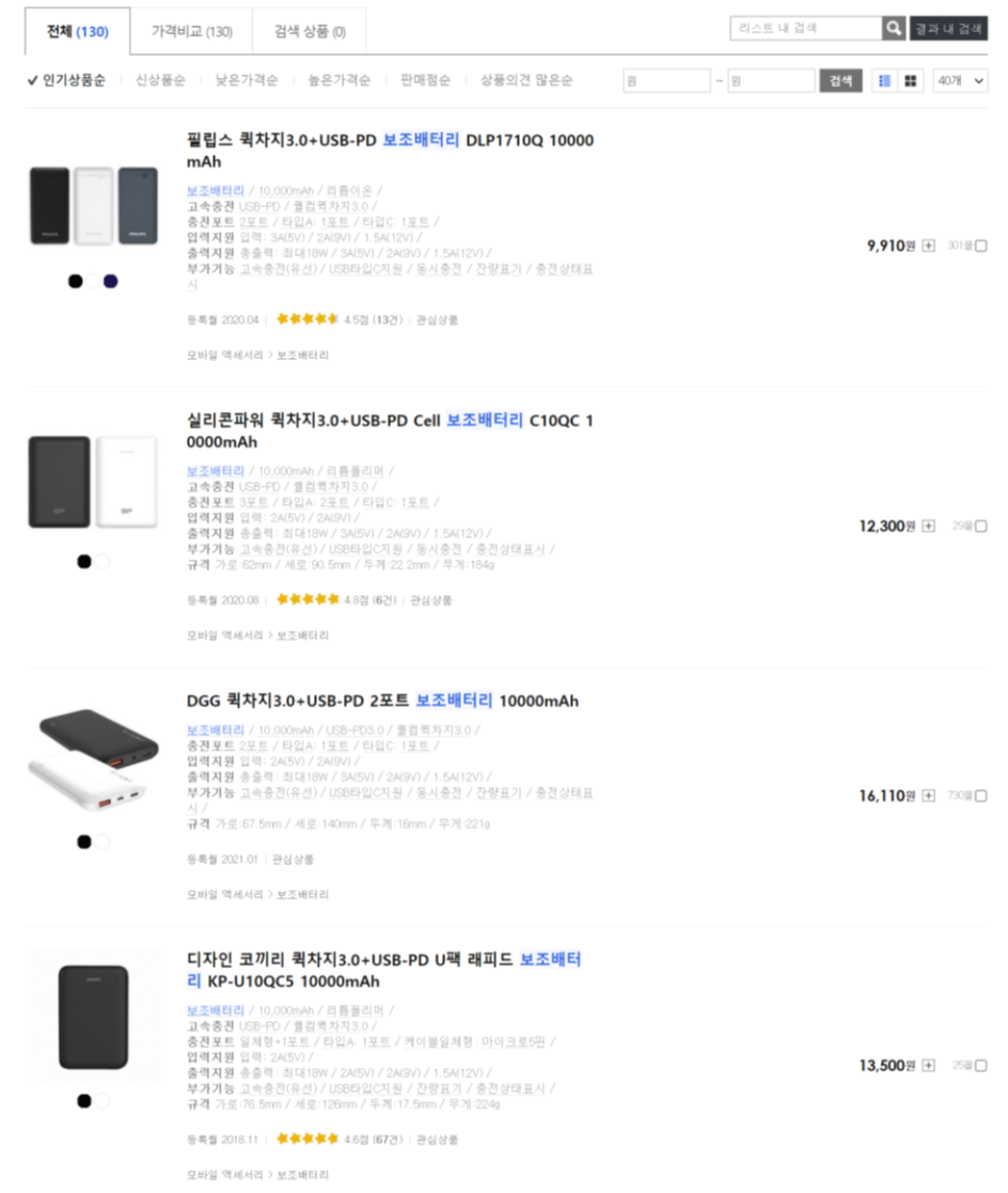 다나와 검색결과: 10,000mah + Qc3.0 고속충전 지원