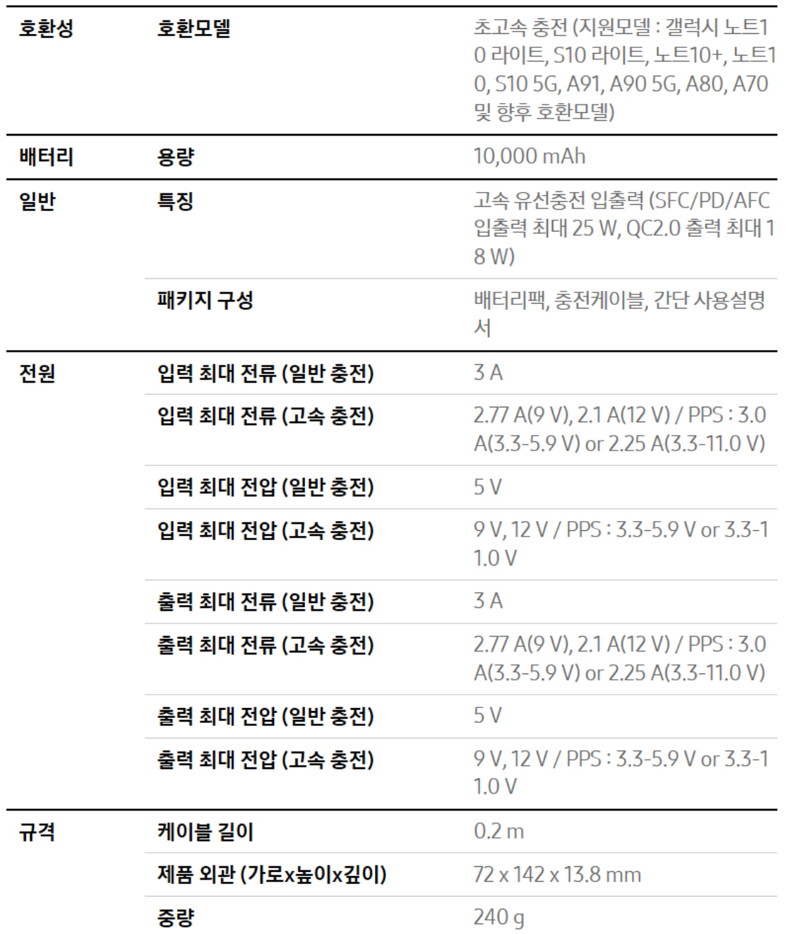 10,000mah에 고용량 PD 충전을 바라는 건 욕심이겠지만 그래도 25W 지원함 25W를 지원한다는 건 배터리 충전 역시 18W 보다는 좀 더 빠르게가 가능할 거라 생각! 그럼에도 이 아이가 매력적인 이유는 갤럭시 제품을 쓰는 사람들은 25W의 초고속 급속 충전 기능을 이용할 수 있음 현재 화웨이인가의 급속충전 SFC / 삼성 급속충전 PPS / 보통 잘 알려진 급속충전 QC / 일반 고속충전 AFC 등 급속 충전을 구분하는 기능들이 있는데 삼성 보조배터리 답게 PPS 언급을 하지 않아도 지원해줌 ㅋㅋ 단점: 샤오미 보조배터리의 두 배인 가격 / QC2.0은 좀... 장점: 갤럭시탭, 갤럭시 폰을 쓰는 사람의 경우 초고속 충전을 지원하는 배터리라고 생각! + 두께와 무게가 가성비 샤오미보다 훨씬 좋음!