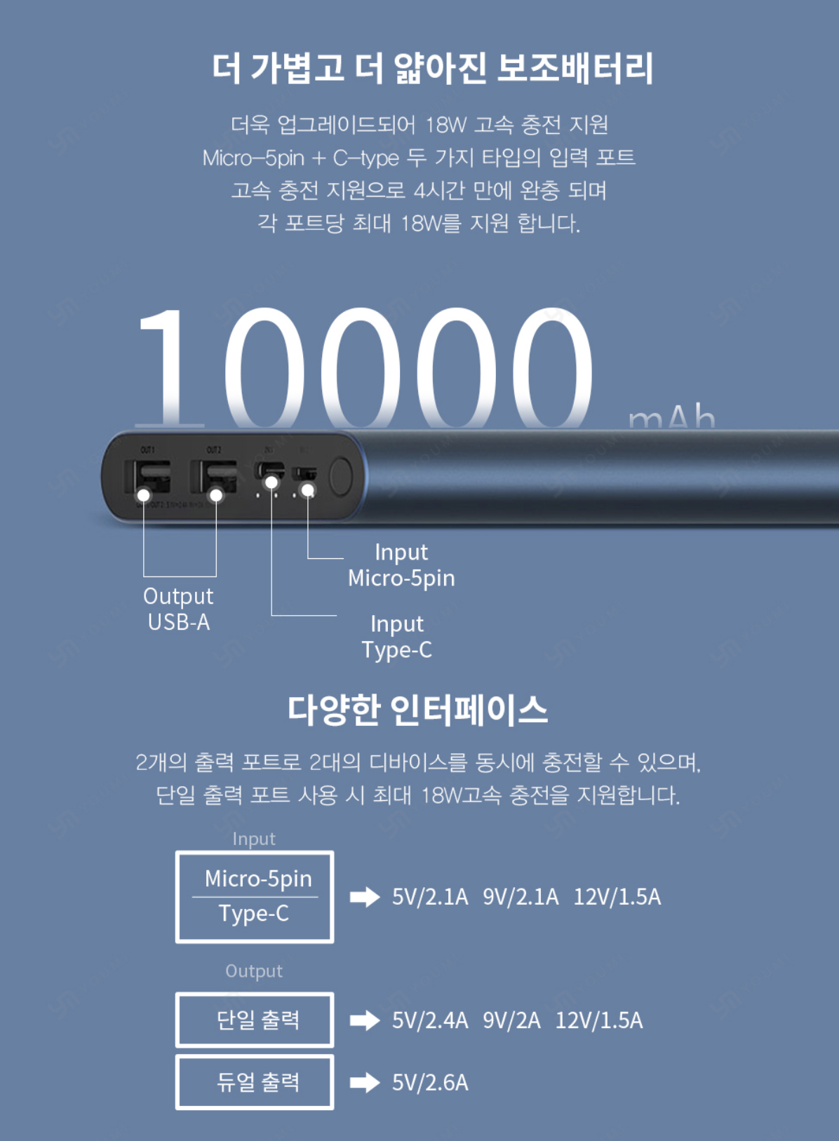 출시된지 1년 정도 된 제품 18W 고속 충전은 가능하나, 고속 충전 기술 언급이 없음 - QC, USB PD 등 (아래 사진을 보면 QC3.0 지원하는 보조배터리 많음 - 이미 마음이 뜸 ㅋㅋㅋ) 이름은 여러가지이나 공홈의 정식 명칭은 "10000mAh Mi 18W 고속 충전 파워뱅크 3" 파워뱅크 3이지만 5세대라고 검색해야 검색됨 ㅋㅋㅋㅋ 2세대와 구분하기 힘든 디자인(입력 칸에 C타입 입력이 있어야 5세대) 그런데도 굳이 비교하는 건, 휴대성과 무게의 기준이 되어야 해서!
