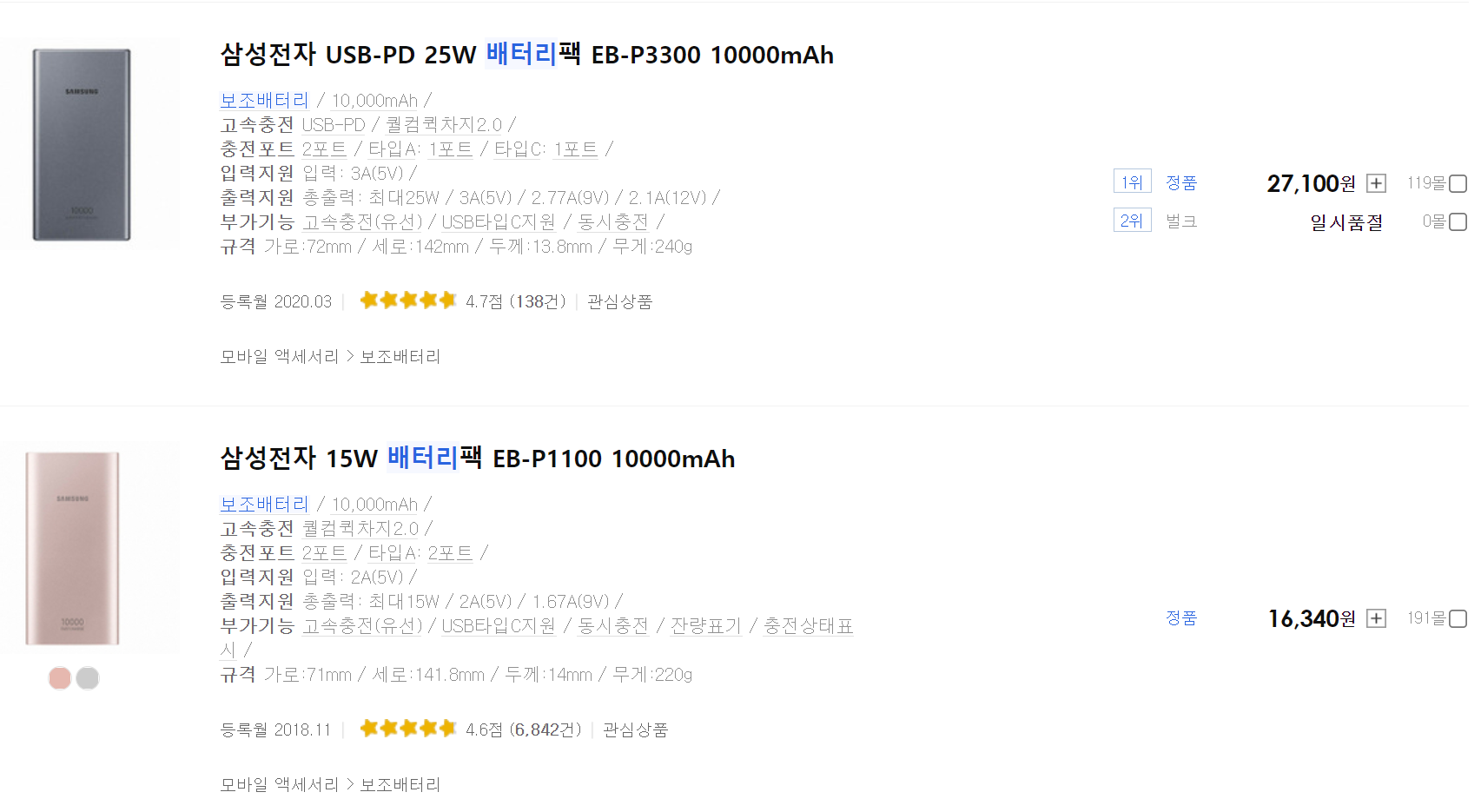 다나와 검색결과: 10,000mah + Qc3.0 고속충전 지원