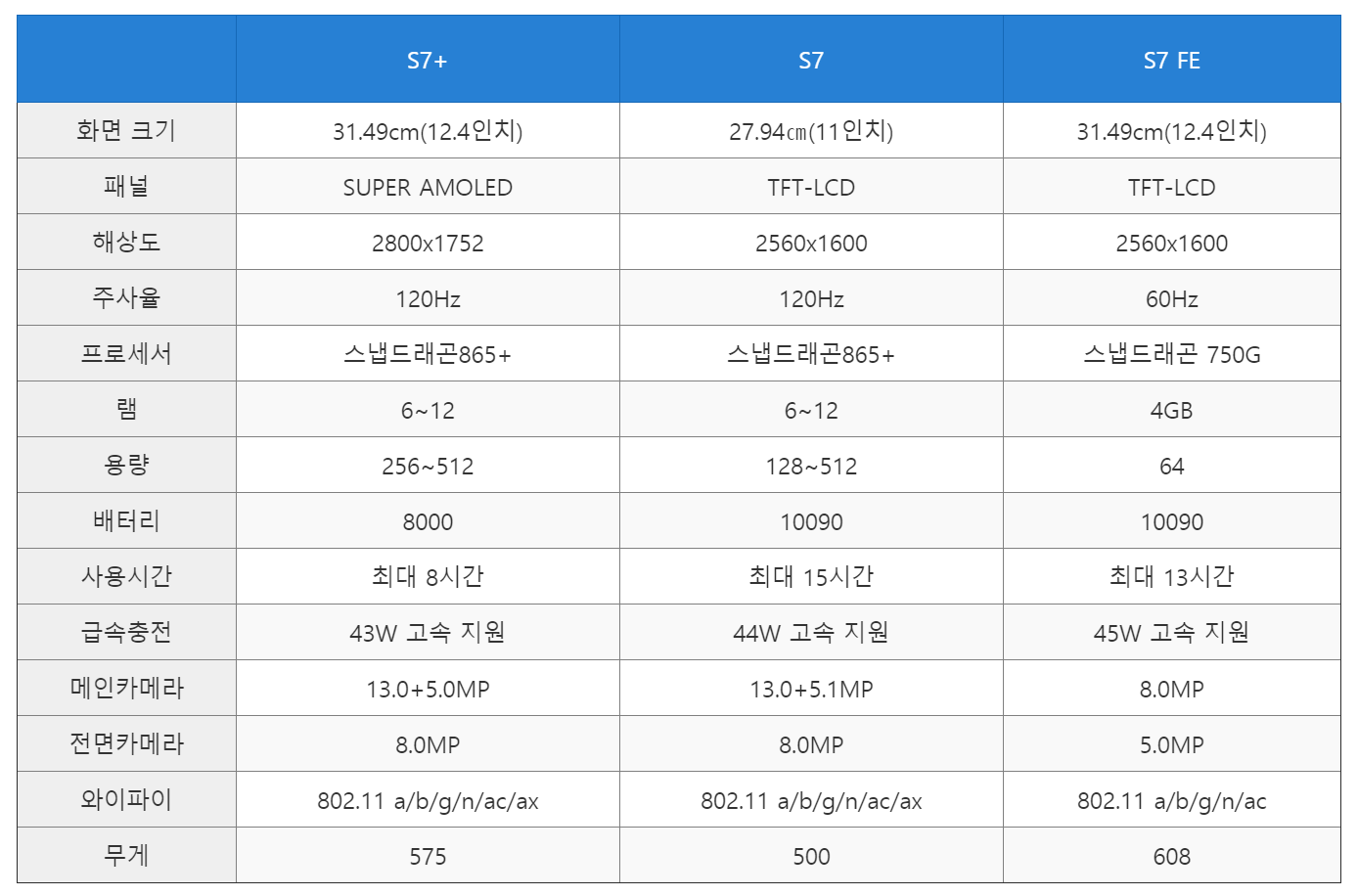갤럭시탭 S7, S6, S6 Lite 사양 비교 (구매전 알아봐야 할 것들)