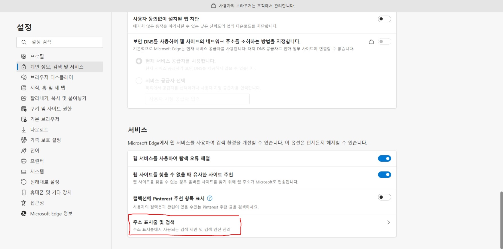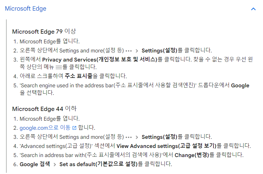 그래서 이번 기회에 엣지 브라우저의 기본 검색엔진을 구글로 변경해보았다.