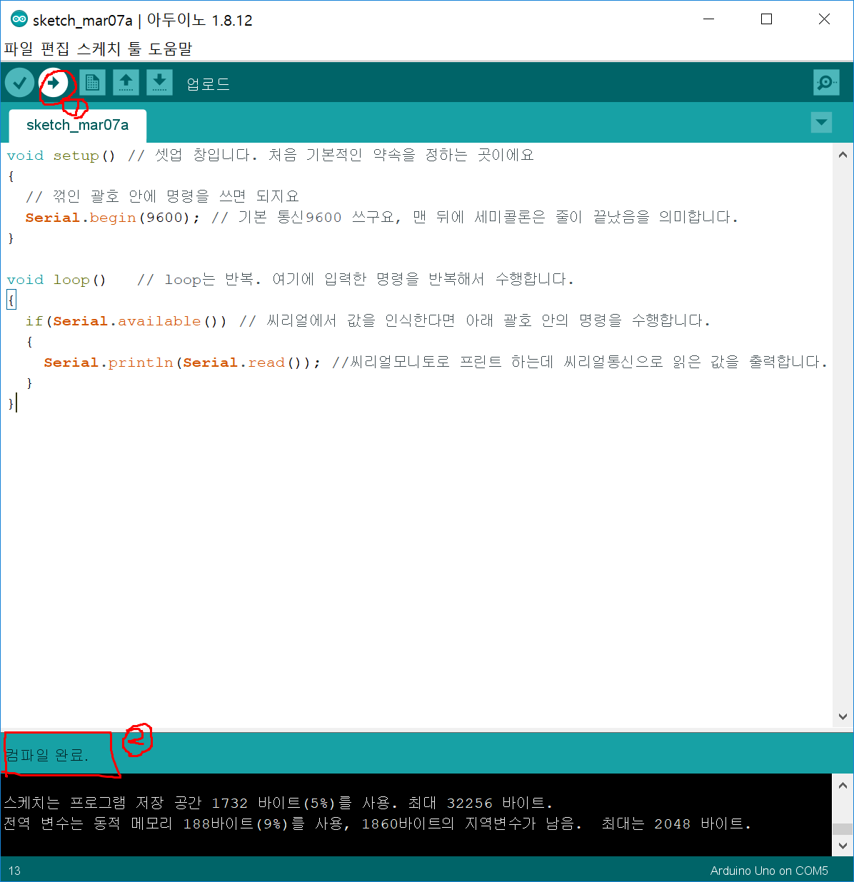 Serial.begin(9600); // 기본 통신9600 쓰구요, 맨 뒤에 세미콜론은 줄이 끝났음을 의미합니다.