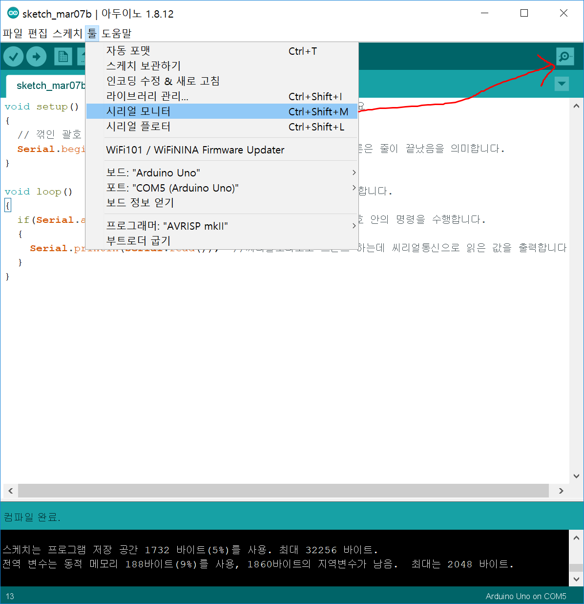 그런 다음 시리얼 모니터를 열어줍니다.