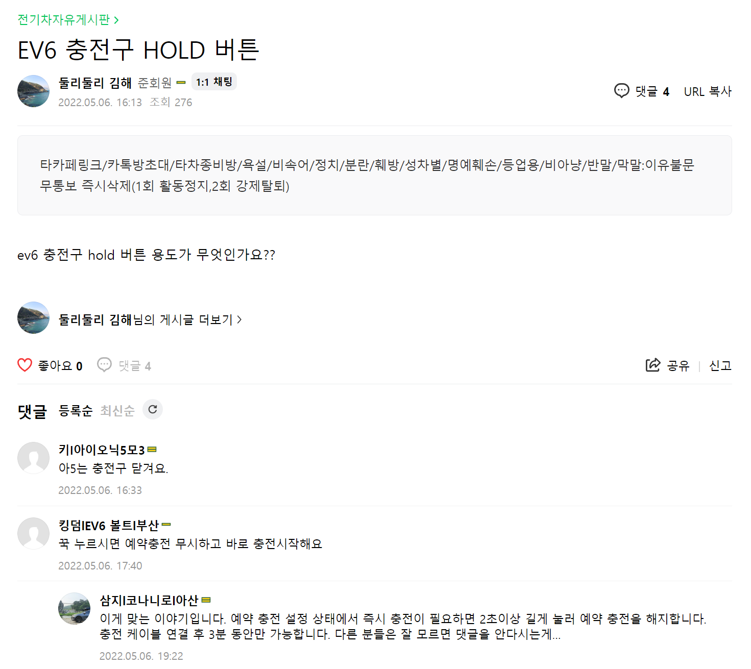 1) EV6 충전구 닫힘 버튼 밑에 홀드 버튼을 누르면 된다고 한다.