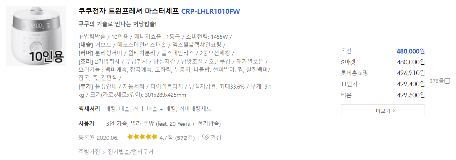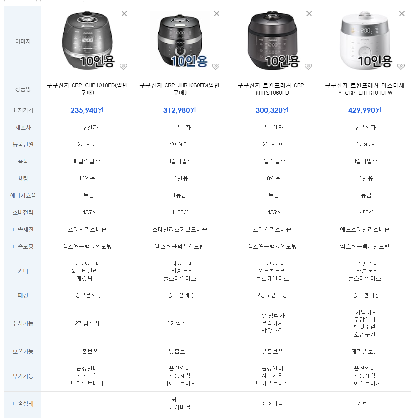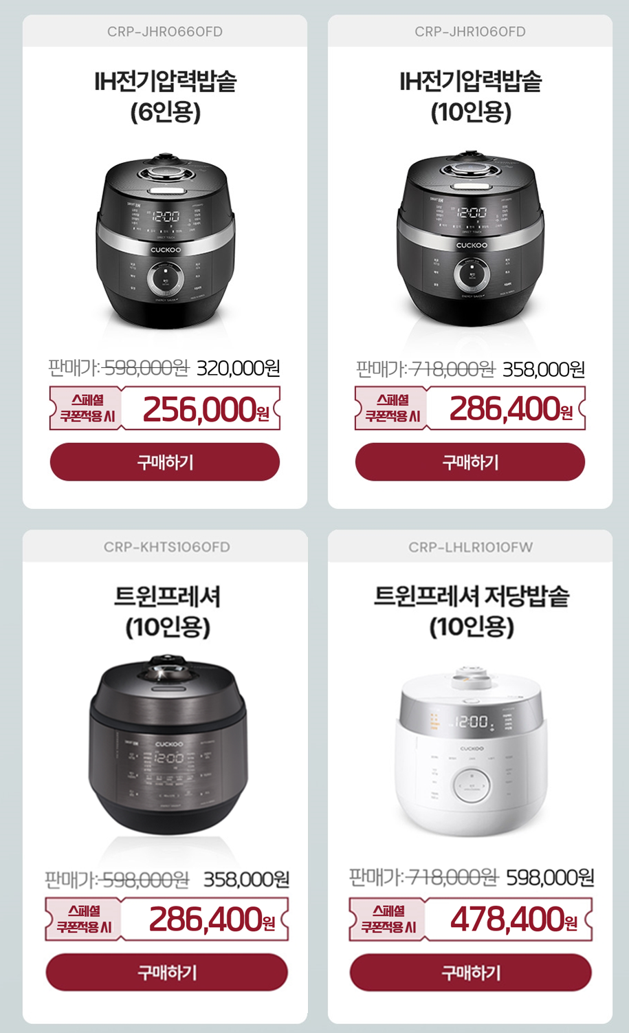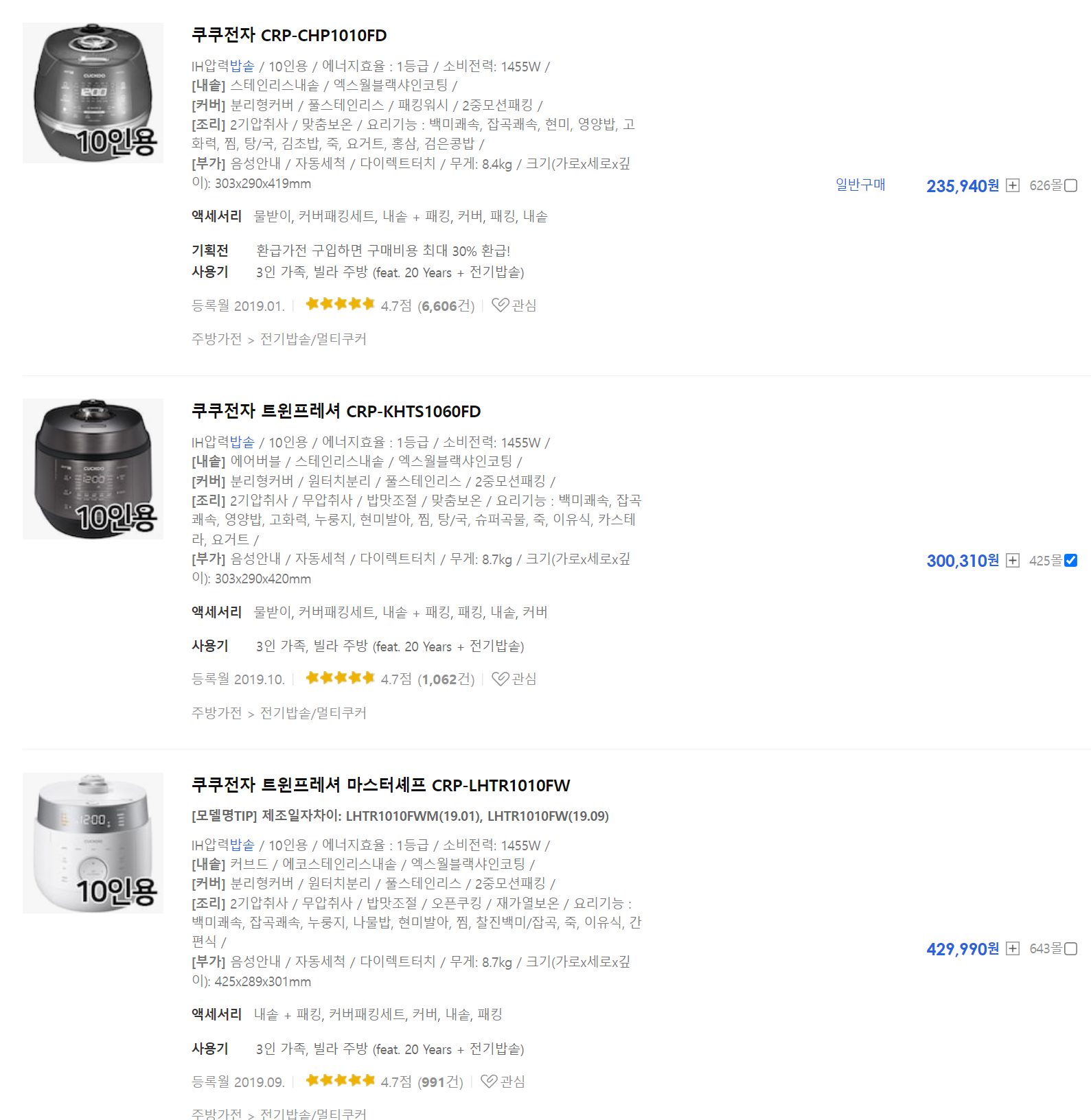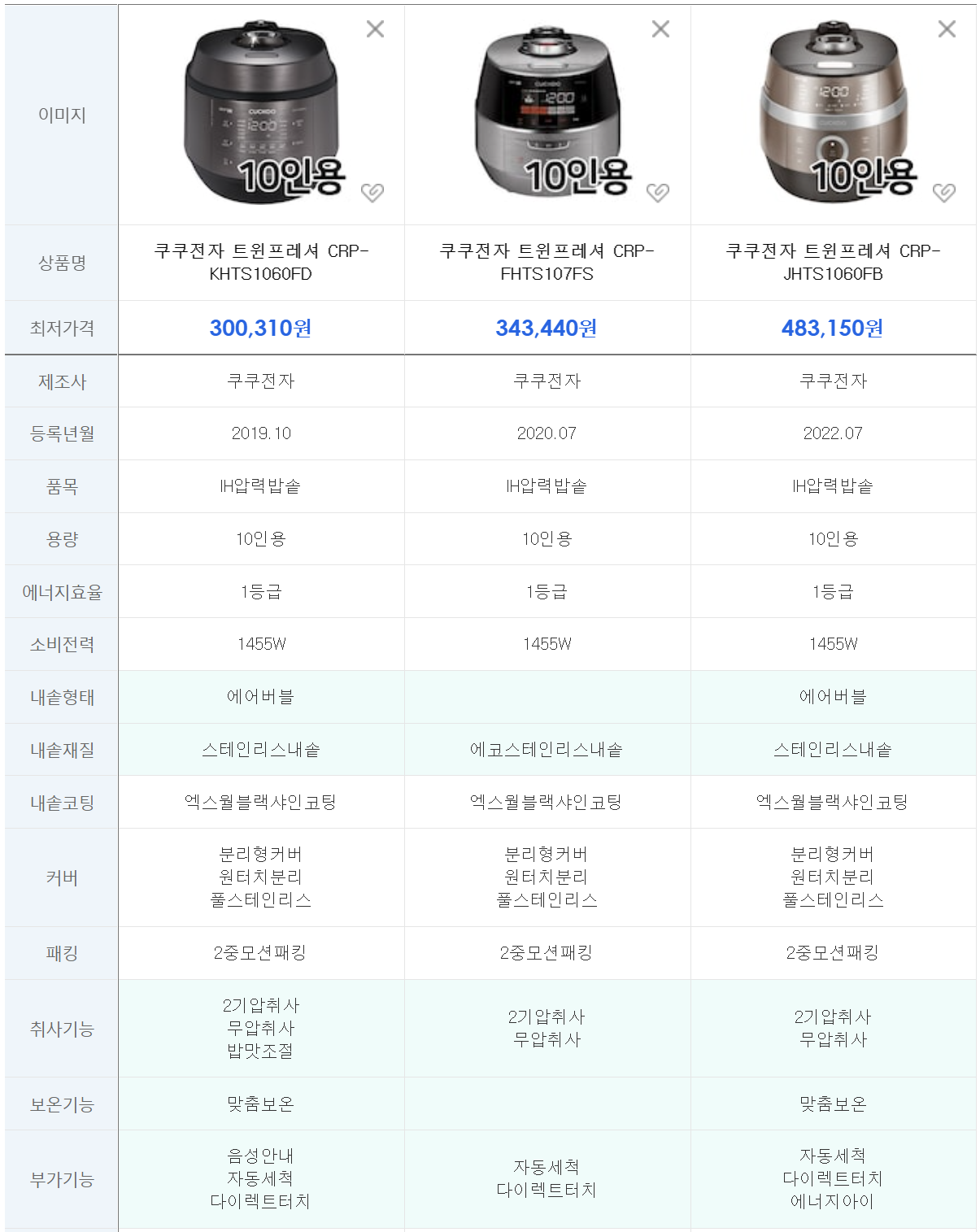 그래서 이왕이면 쿠쿠에서 IH 압력밥솥 이상의 10인용 제품을 조금 비교해보고자 한다!