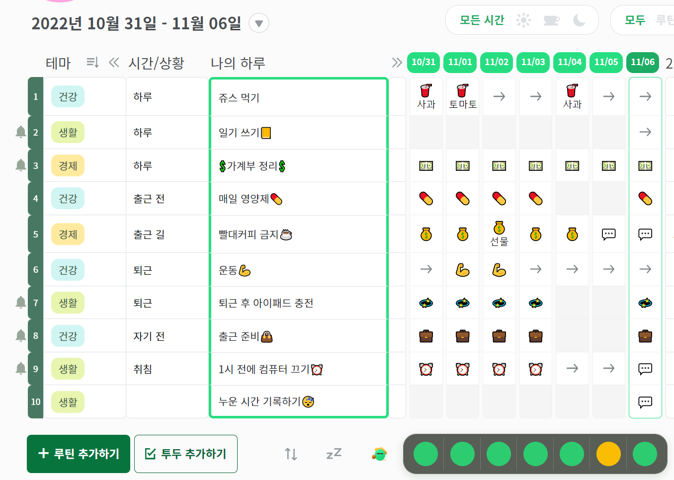 내가 목표한 바에 어울리게 주n회 반복으로 메뉴를 바꾸고(운동, 쥬스, 컴퓨터 끄기 등)