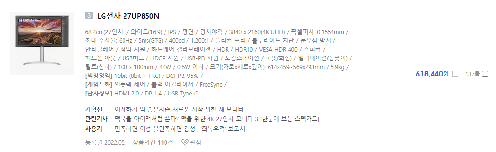 전문가가 아니니까 색영역은 포기할 수 있어요... 라는 마음으로 선택한 모니터는 27UP850N