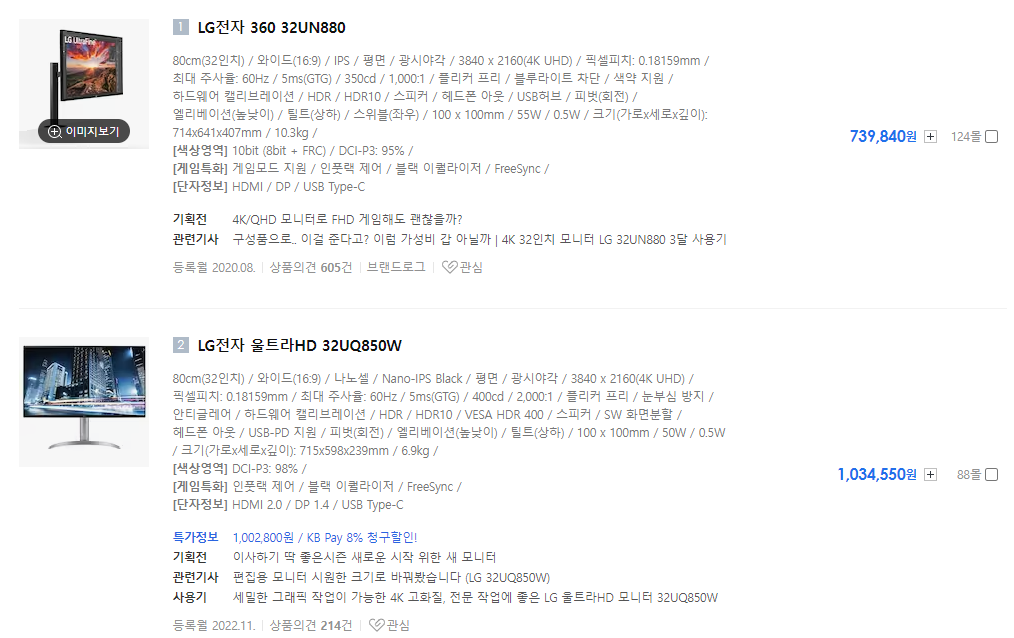 베스트샵 기준 32UN880 75만 / 32UQ850W 109만(할인하면 99만)