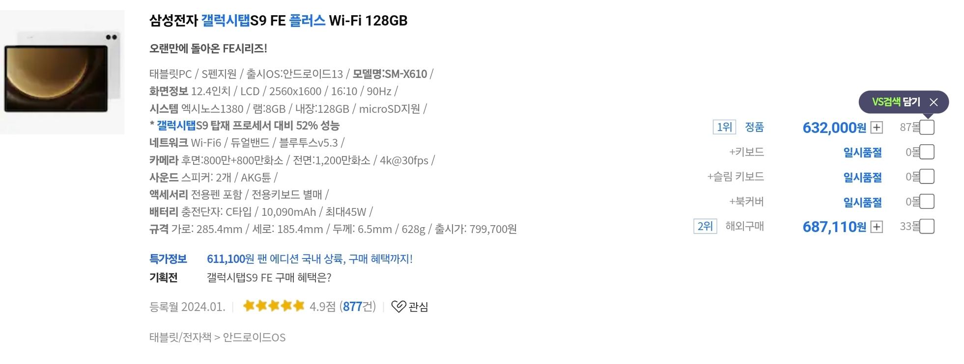 삼성전자 갤럭시탭S9FE 플러스 SM-X610 WiFi 256GB