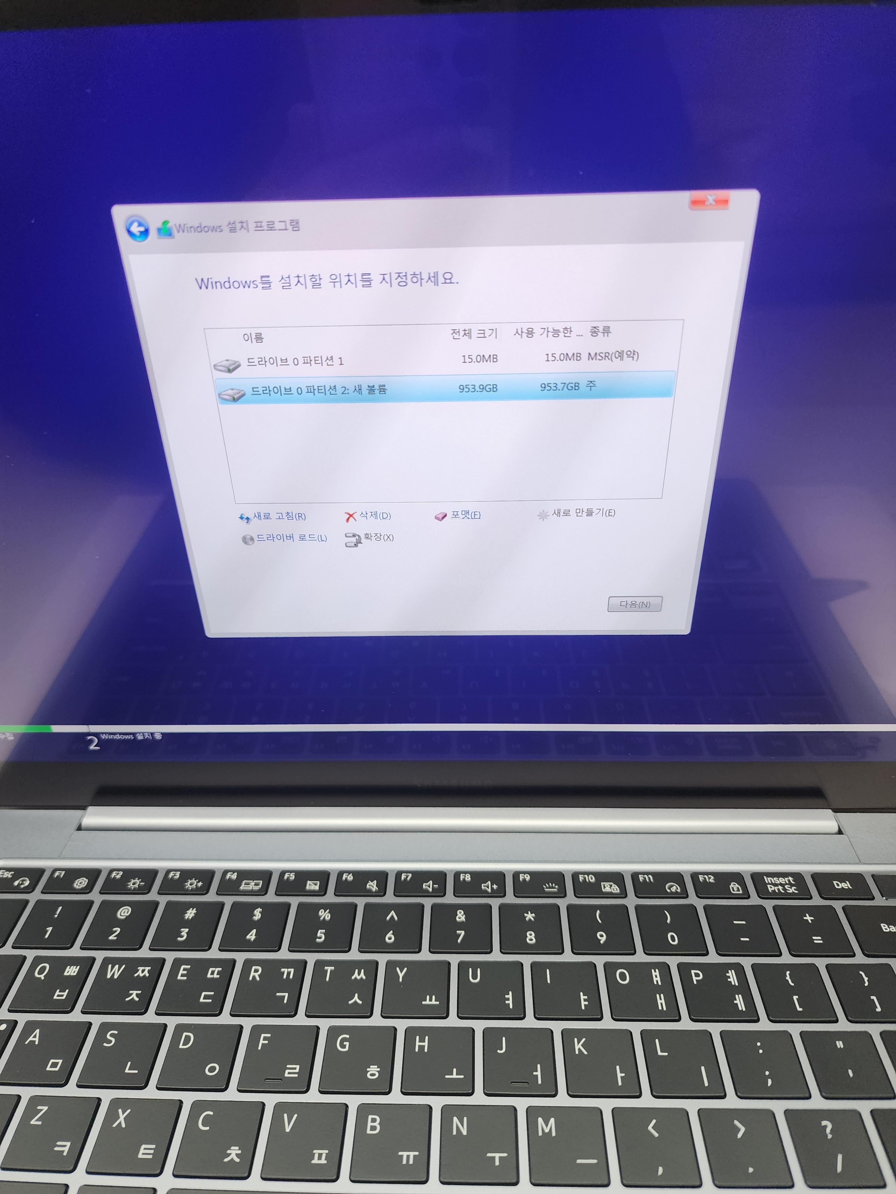 삼성 설명서 동봉되어 있는 윈도우 설치 단계 화면과 다르고 어차피 교체한 하드라면 특별히 뭐 들어있지 않을 거 같아서 둘 다 파티션을 삭제(D)로 제거하여야 여유 장치가 되고 설치 영역을 만들 수 있었다...