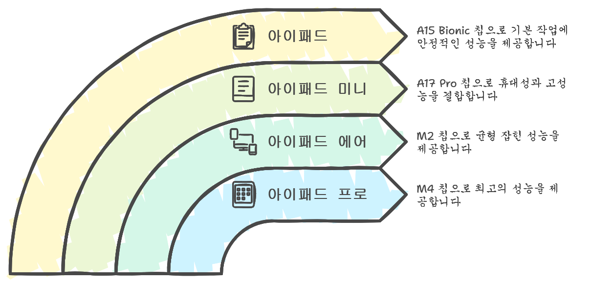 아이패드 프로 라인은 저장용량에 따라 약간씩 칩셋의 차이가 있겠지만 M4칩셋, 아이패드 에어는 M2칩셋, 현재 판매하고 있는 아이패드와 아이패드 미니 6세대에 쓰인 A15바이오닉 칩셋, 그리고 A17프로 칩셋을 비교해봤습니다.