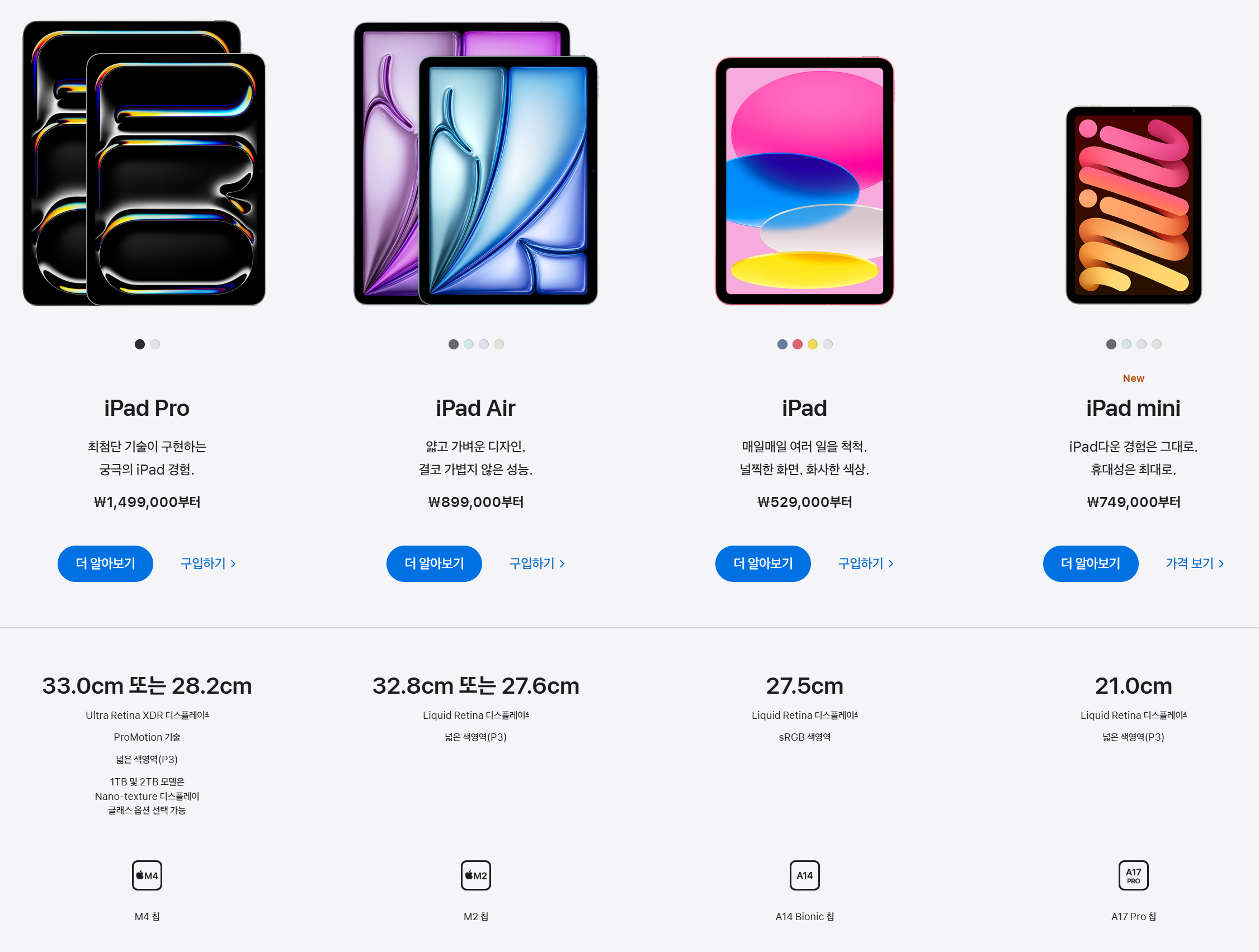 아이패드 프로 라인은 저장용량에 따라 약간씩 칩셋의 차이가 있겠지만 M4칩셋, 아이패드 에어는 M2칩셋, 현재 판매하고 있는 아이패드와 아이패드 미니 6세대에 쓰인 A15바이오닉 칩셋, 그리고 A17프로 칩셋을 비교해봤습니다.