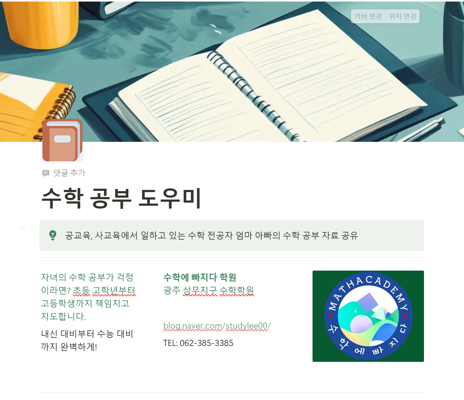 그 전에 공유 페이지를 통해 학습지를 무료로 공유할겸 어차피 공유한다면 뭐라도 이득이 되면 좋을 거 같아서, 수학 학원을 소개글을 첨부하였습니다.