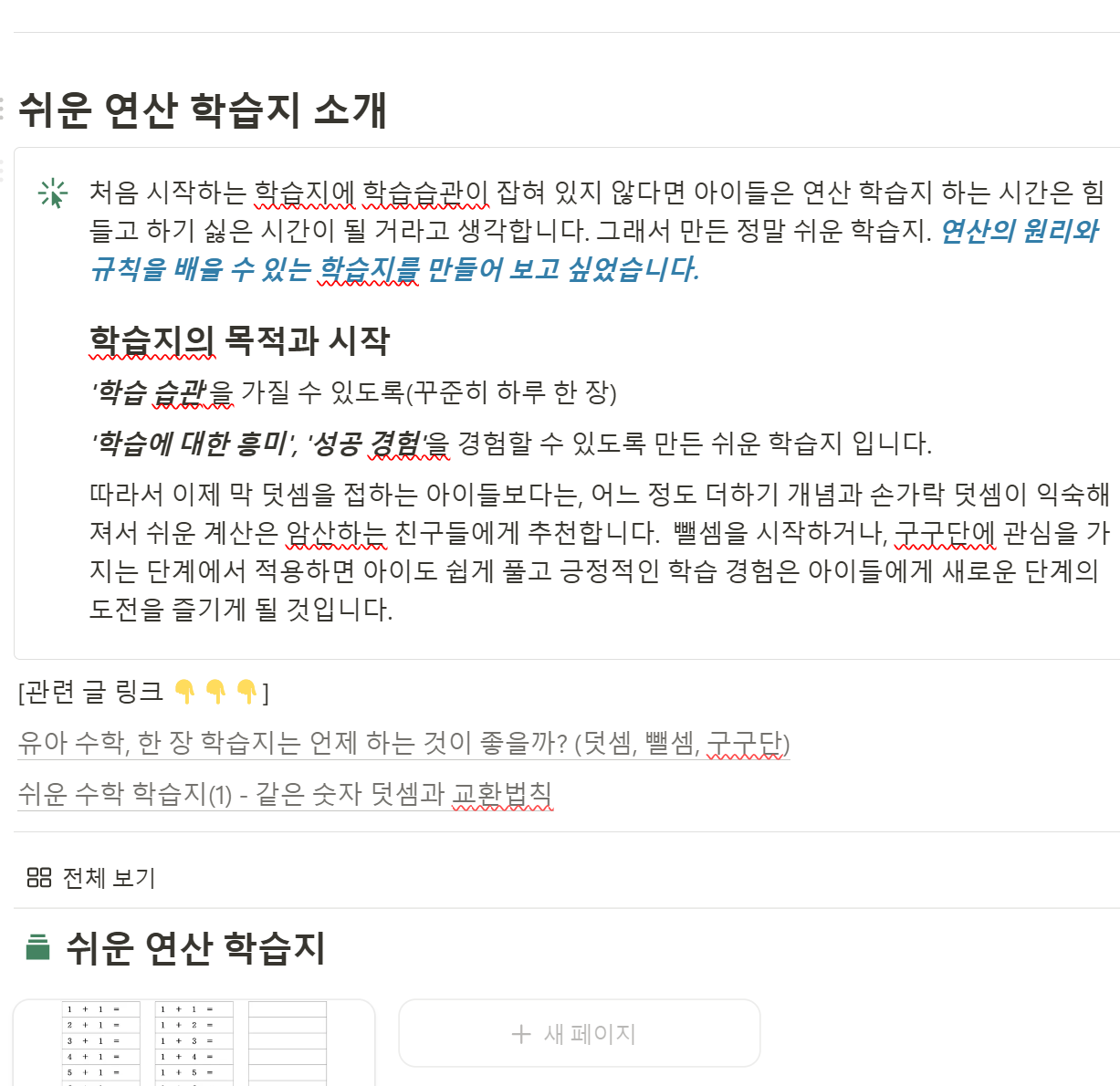• 단점: 블로그 포스트에 학습지를 공유하면 업데이트가 번거롭고, 새로운 자료를 추가하려면 기존 게시글을 수정하거나 새 글을 작성해야 합니다. 또한 자료를 체계적으로 정리하기 어려운 경우가 많습니다.
