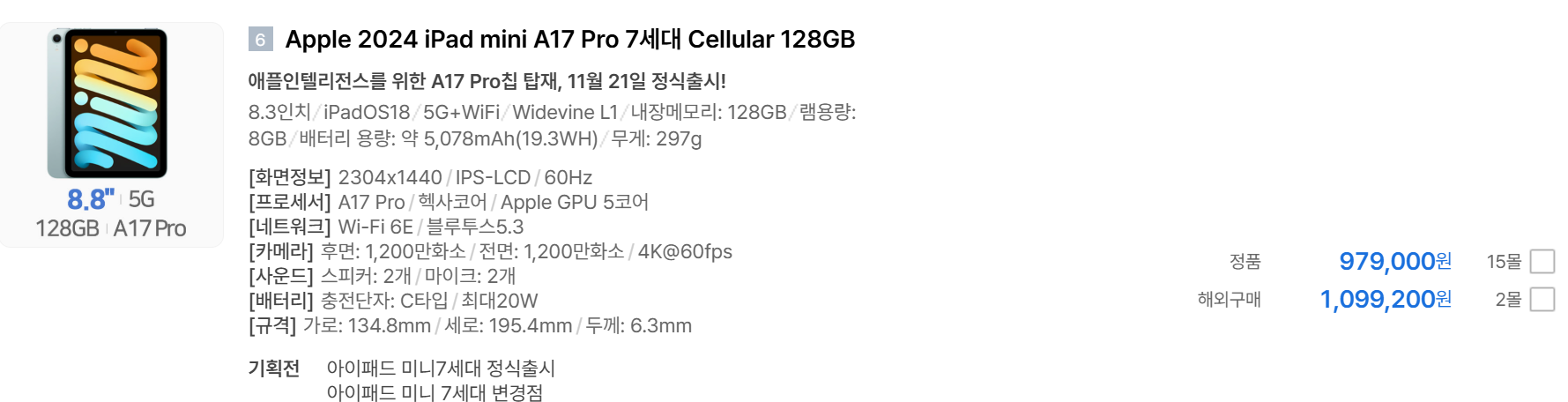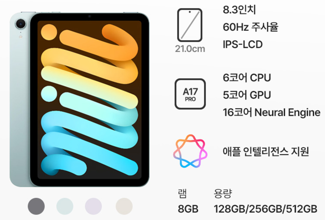 최신 칩셋 탑재: 아이패드 미니 최신 모델은 A17 프로 칩을 사용하며, 이는 이전 세대보다 최대 30% 향상된 CPU 성능과 25% 향상된 GPU 성능을 제공합니다.