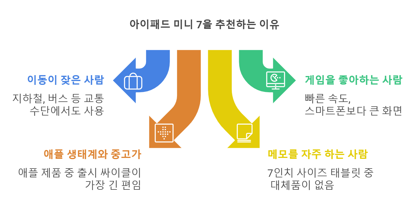 다른 모델과의 차별성: 아이패드 프로(11인치~12.9인치)나 에어(10.9인치)와 비교해 가방이나 주머니에 넣기 적합해, 휴대성을 중시하는 사용자에게 이상적입니다. 뿐만 아니라 7인치 태블릿을 선호한다면 성능적인 면에서 최고 사양의 태블릿입니다.