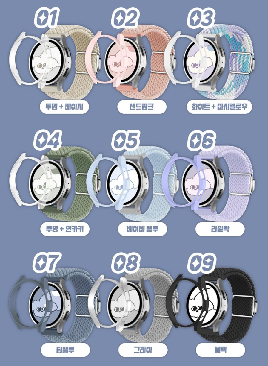 그래서 이왕 포스팅 쓰는 김에 제 개인적으로 편하고 예뻤던 케이스+ 스트랩 세트 추천드릴께요. 아내 선물이라 고급지게 밀레니즈 루프 세트를 샀지만 저는 사실 개인적으로 다른 스타일의 스트랩을 좋아하거든요. 제가 가장 오래 착용했던 스타일은 나일론 소재의 늘어나는 스트랩인 솔로루프 마그네틱 세트, 베이비블루와 라일락 조합은 정말 예쁜거 같아요. 밀착감이 좋아 왠지 삼성헬스 측정이 더 잘 될 거 같은 느낌?? ㅋㅋㅋㅋ 약간 늘어나는 나일론 소재가 촥 밀착되는거 같아서 편하긴 한데 ㅠㅠ 아무래도 니트소재라 늘어남과 얼룩이 있기도 하죠.... 저는 애용하는 밴드였습니다.
