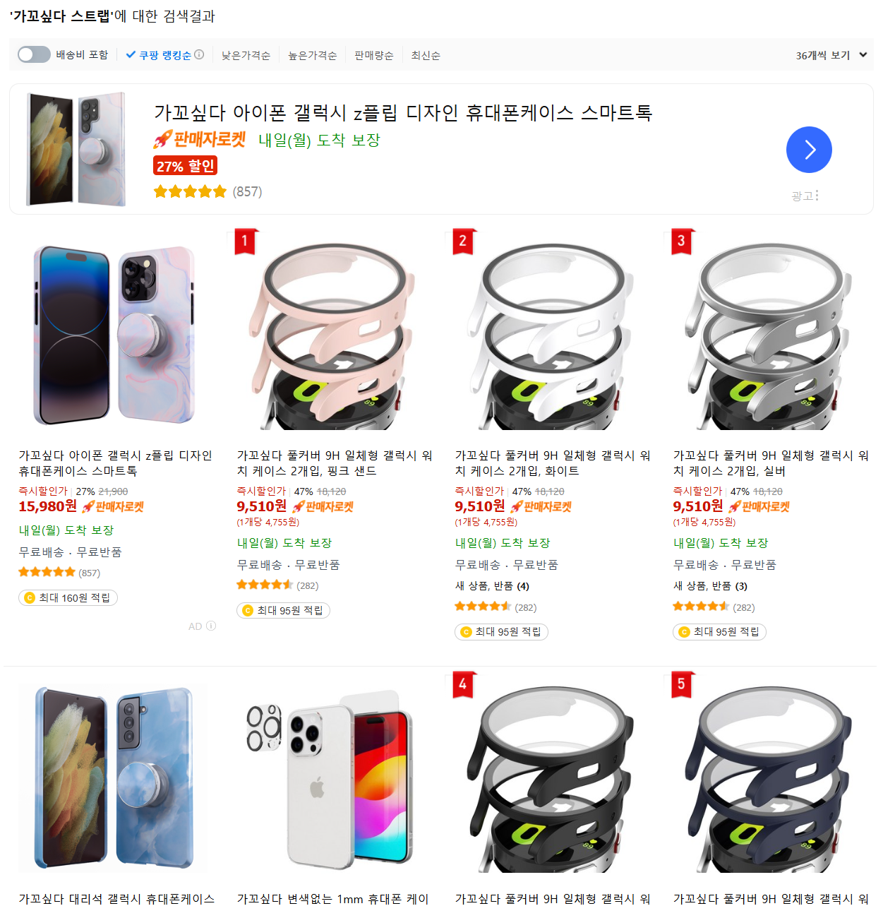 아래 검색 예시는 가꼬싶다 풀커버 강화유리 케이스의 색상 사진입니다. 어라 핑크샌드 예쁜데 하더라도... 가꼬싶다에서 스트랩을 다루지 않는 이상 색상은 여러분이 맞추셔야 하는데... 이게 생각보다 쉽지 않더라구요 ㅎㅎㅎ