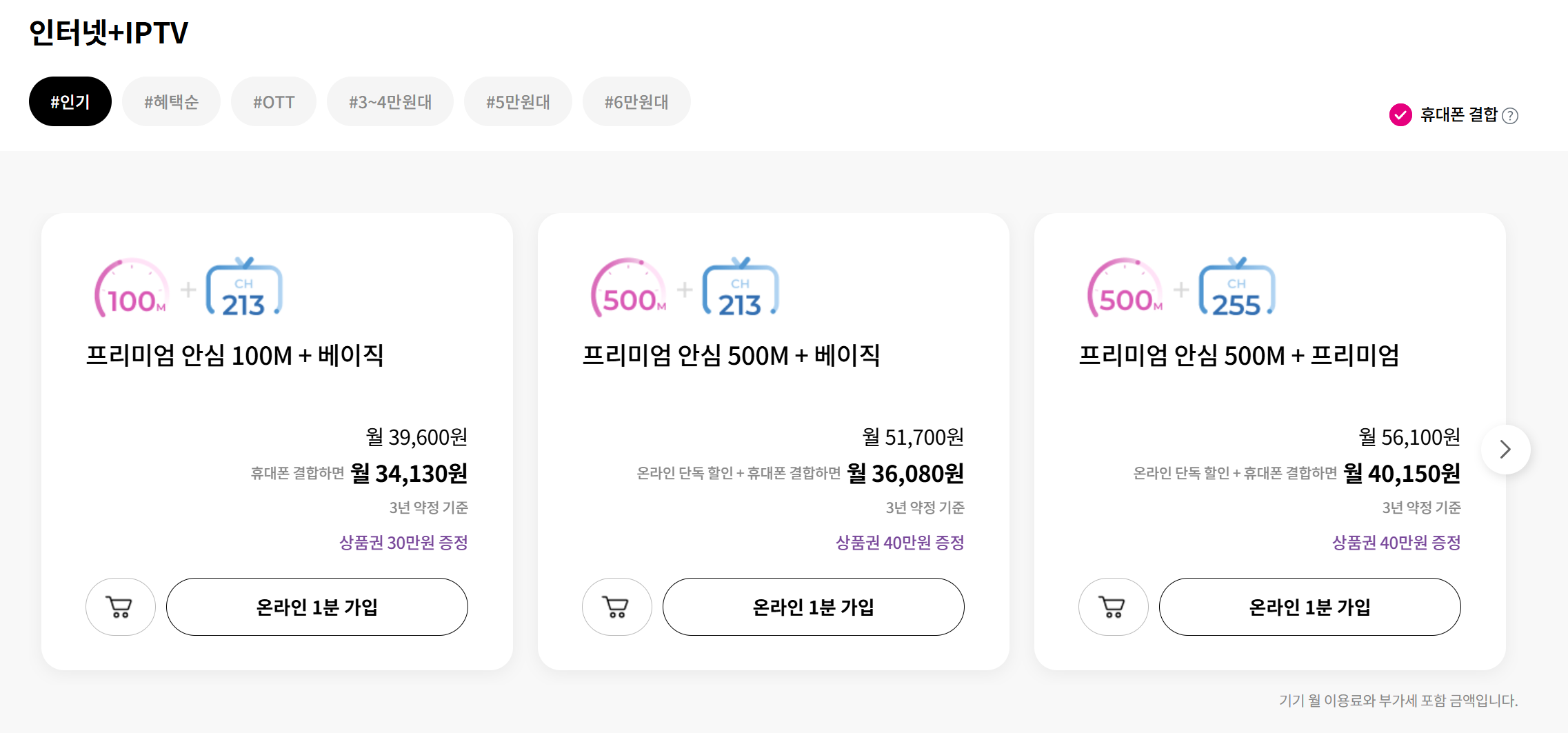 저는 현재 1G 인터넷, 티비는 프리미엄 요금제를 사용하고 있고,
