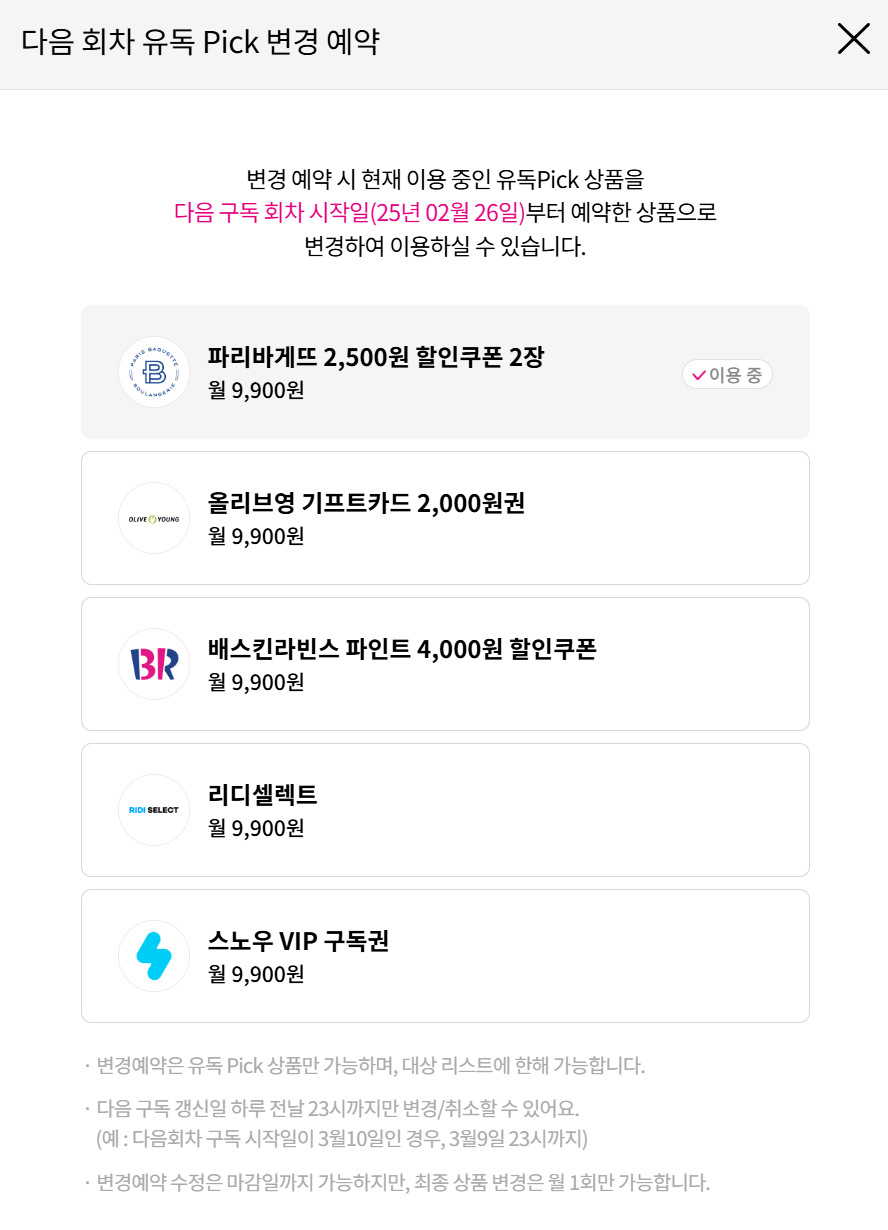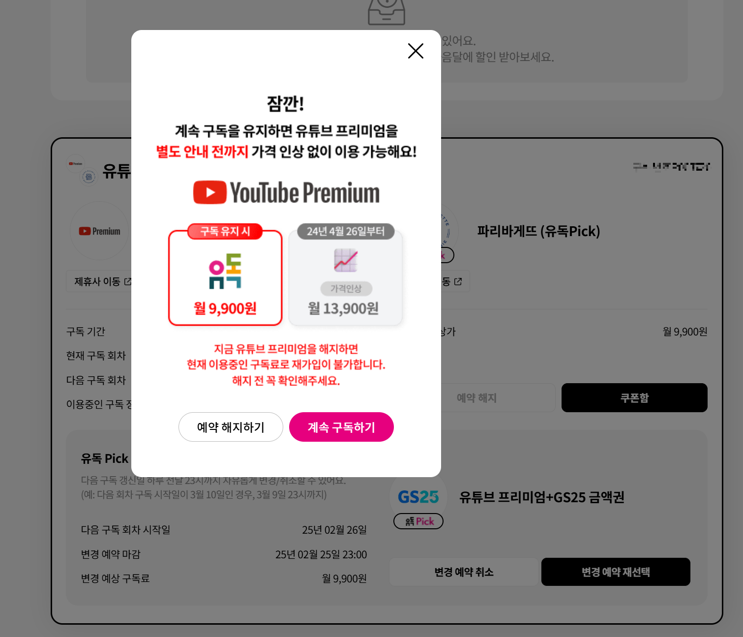 가입하게 된 계기는 유튜브 가격이 인상되는데 9,900원 팩이 있다고 해서 그냥 유튜브 보는 것보다 혜택을 보는게 좋을거 같다고 해서 1년 동안 만족하면서 사용했다. 그런데 잘 사용하던 GS25 카페 이용권이 금액권으로 바뀌고 이마저도 3월부터 없어진다고 해서 26일이 결제일이라 해지를 결정하였다.