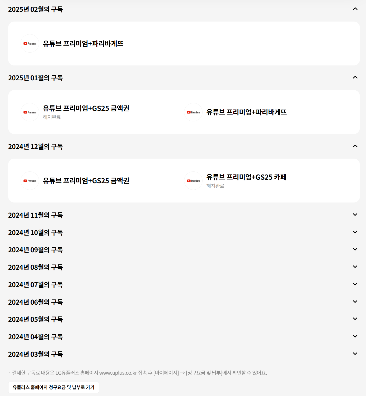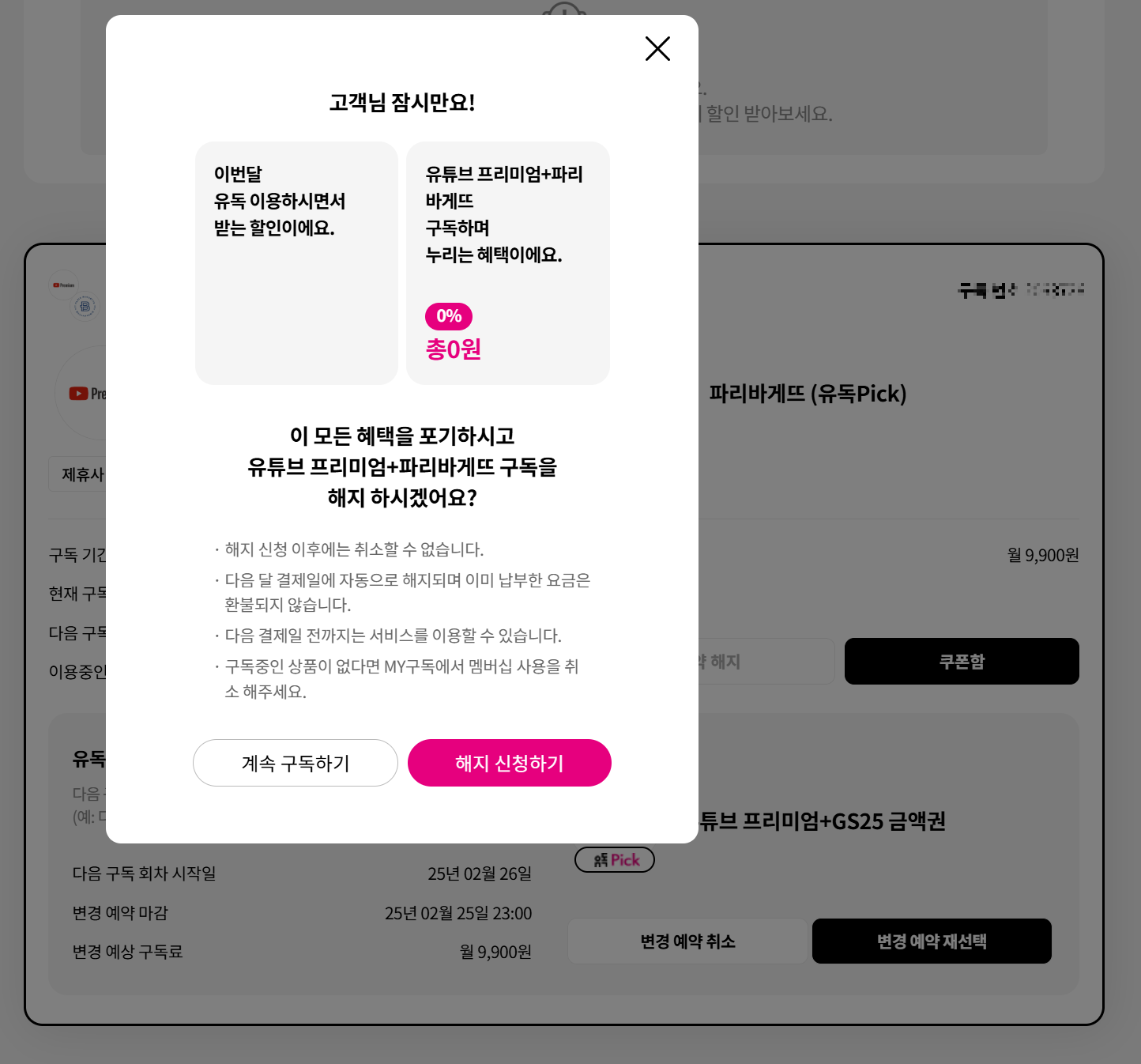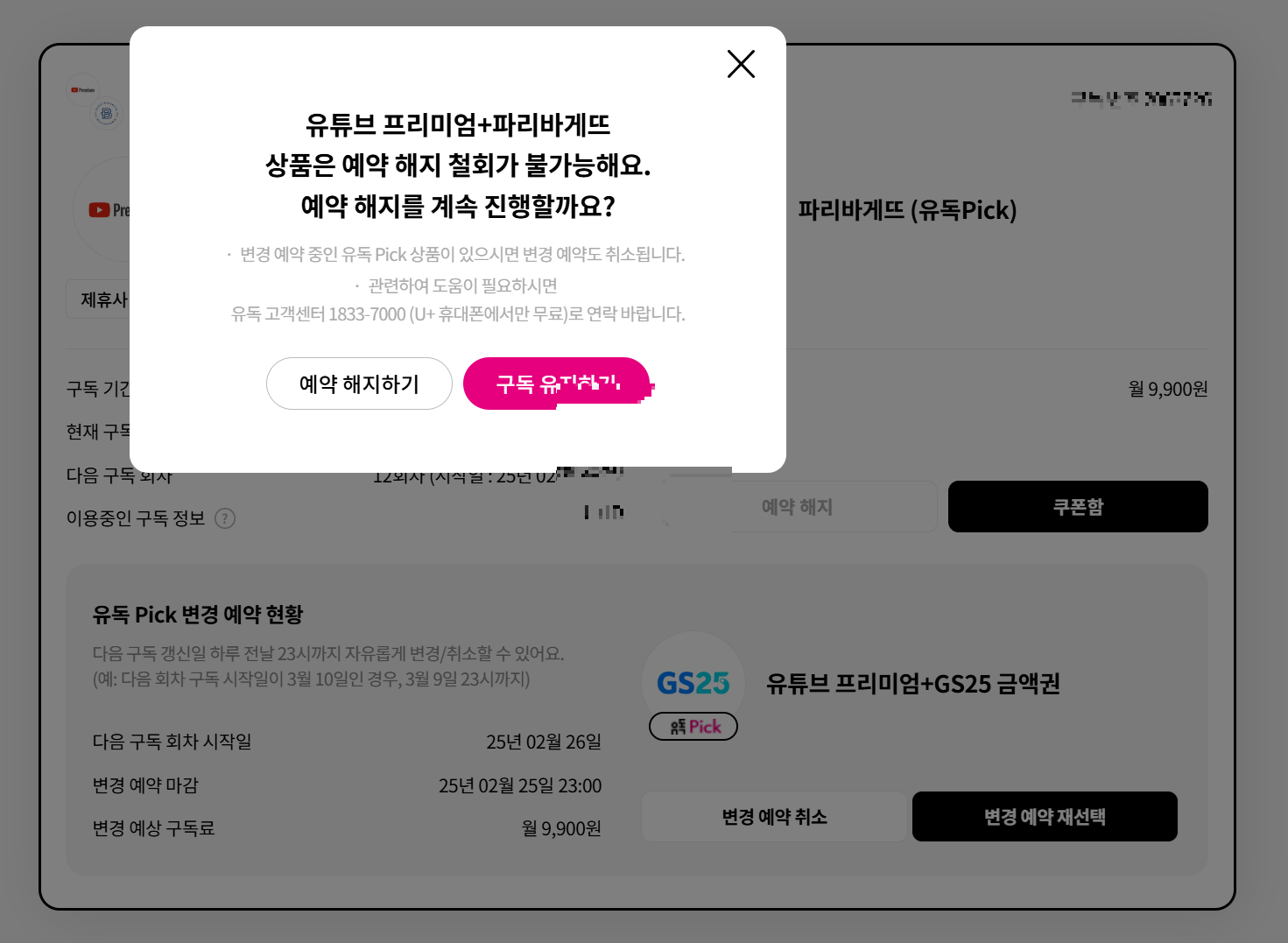 가입하게 된 계기는 유튜브 가격이 인상되는데 9,900원 팩이 있다고 해서 그냥 유튜브 보는 것보다 혜택을 보는게 좋을거 같다고 해서 1년 동안 만족하면서 사용했다. 그런데 잘 사용하던 GS25 카페 이용권이 금액권으로 바뀌고 이마저도 3월부터 없어진다고 해서 26일이 결제일이라 해지를 결정하였다.