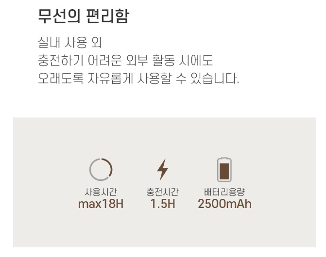 - 2,500 mAh 배터리로 최대 18시간 무선 작동