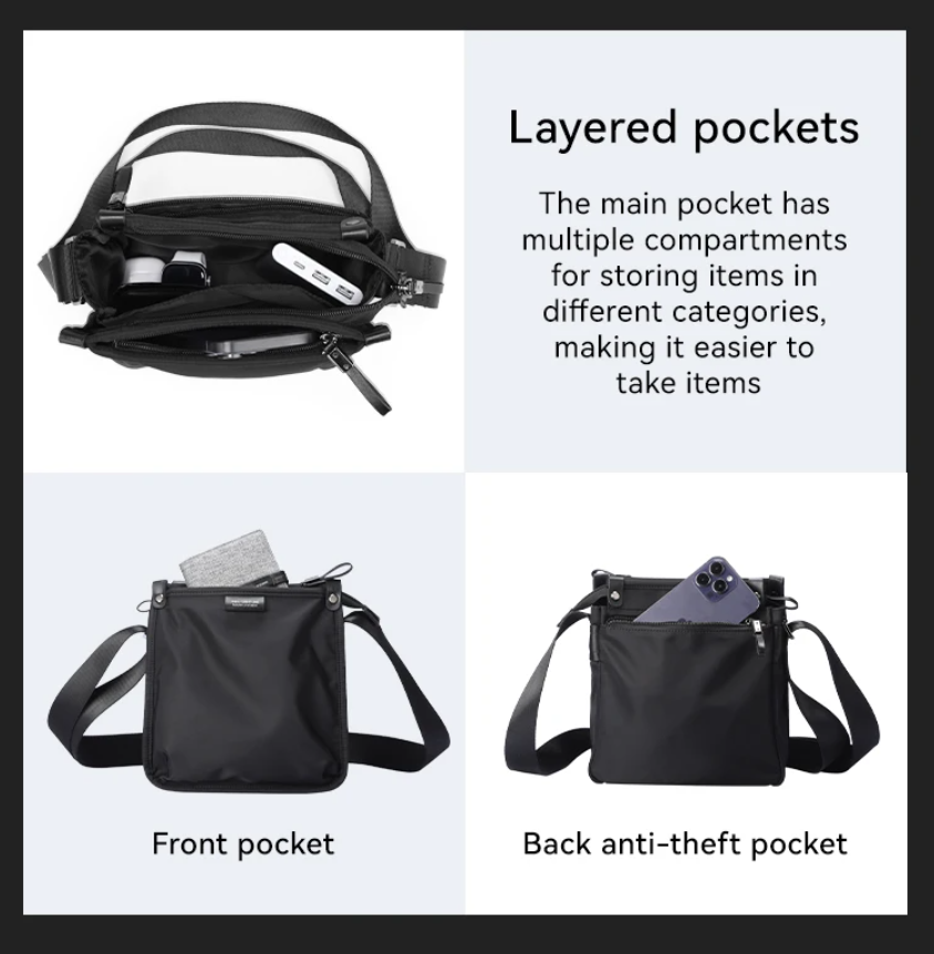 - 옥스포드(Water-resistant) 소재, YKK 지퍼, 내구성 있는 스트랩과 버클