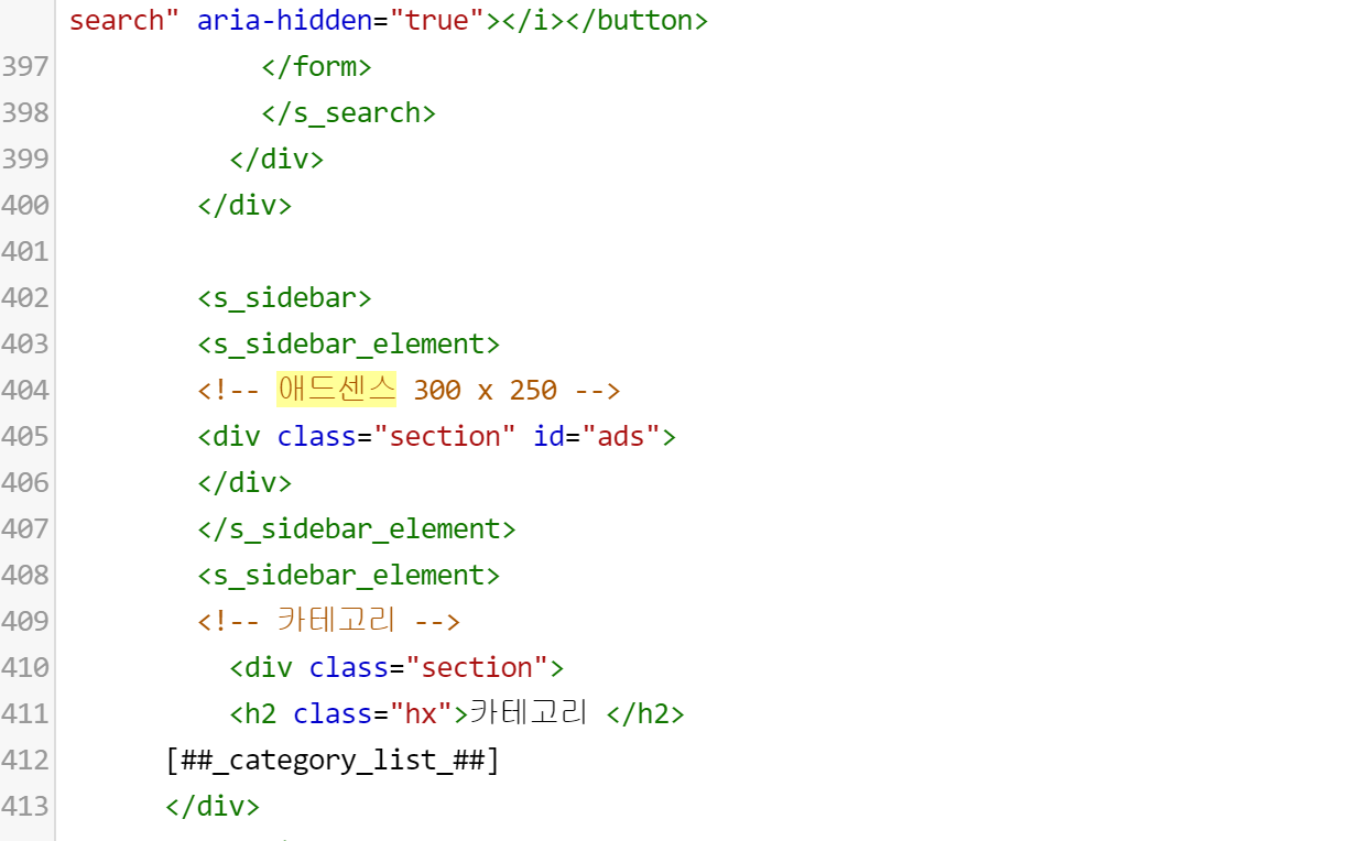 사이드바 광고 삽입하기 <s_sidebar_element <div class="section" id="ads" </div |