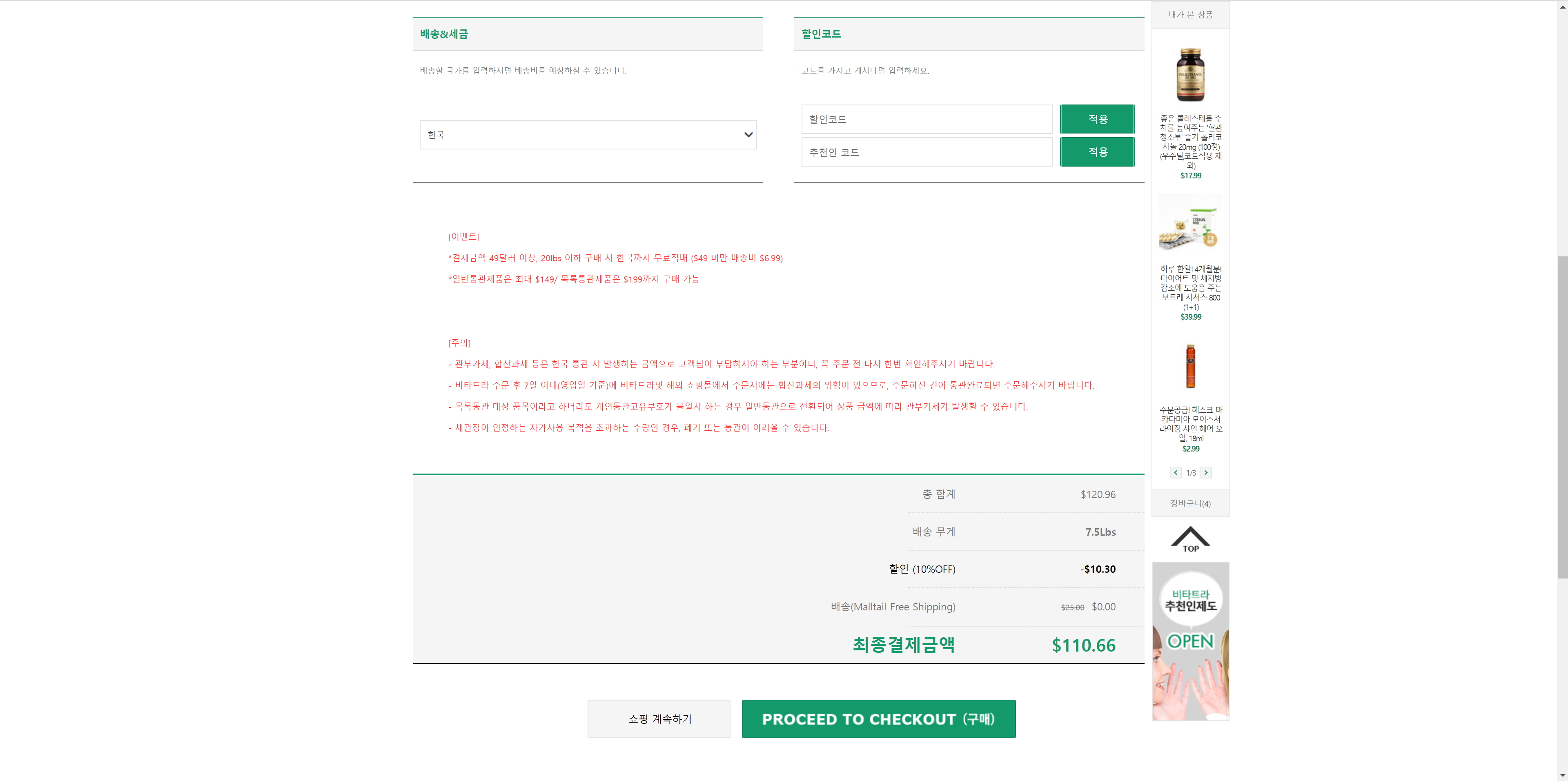 *결제금액 49달러 이상, 20lbs 이하 구매 시 한국까지 무료직배 ($49 미만 배송비 $6.99)