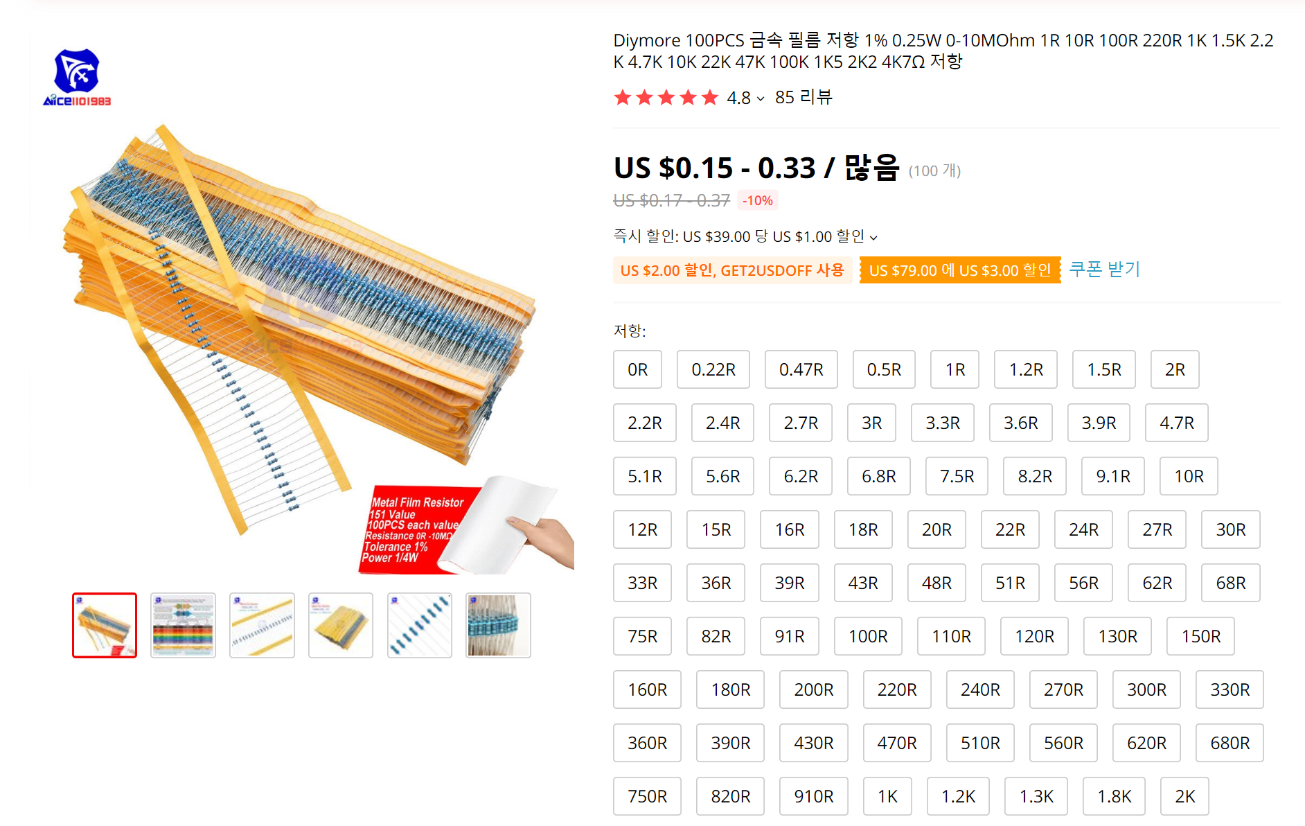 필자의 경우에는 5v 기준으로 62R, 100R, 120R, 150R, 180R, 200R 등을 구매했고,