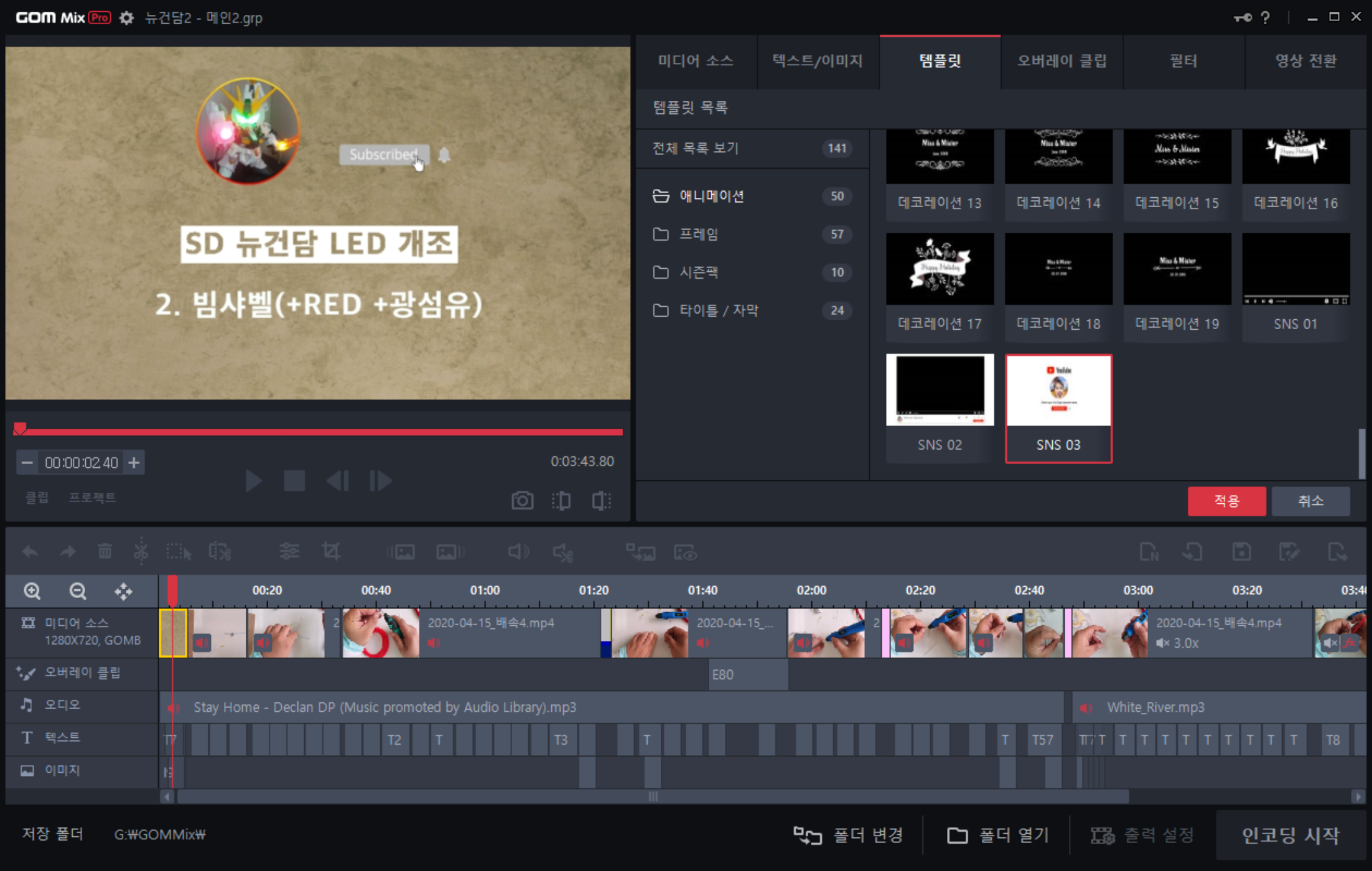 - 보통 무료 음원이 3분 이내니까 3분 안 넘게 영상 잘라주기