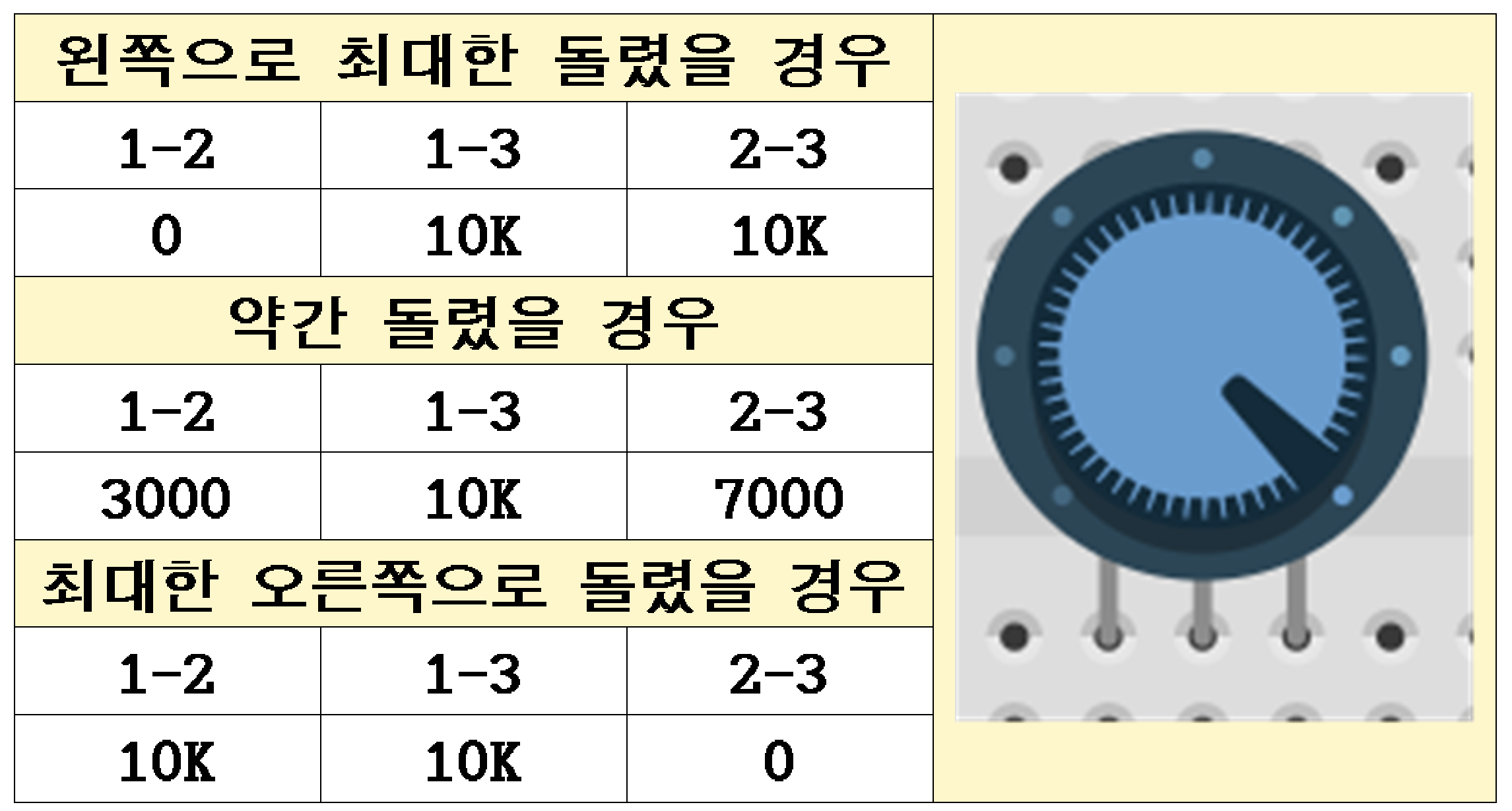 다이얼이 좌측에 있을 때는 저항이 낮고, 다이얼이 우측에 있을 때는 저항이 높아지기 때문에