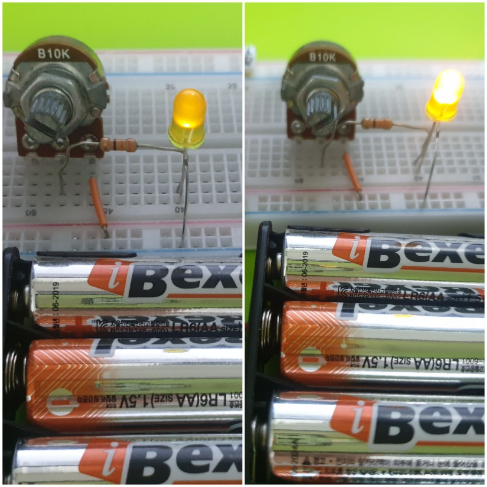 하지만 결과는.... 조절은 되지만 10k옴일 때 전류가 흘러 미세하게 불빛이 살아있다는 것.